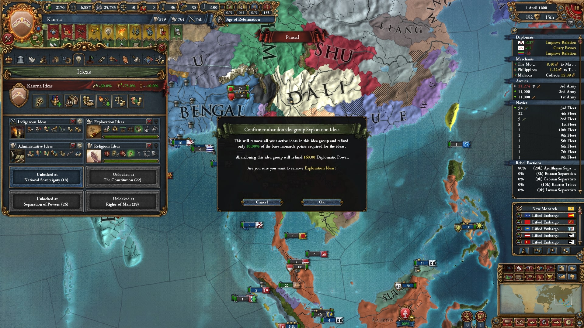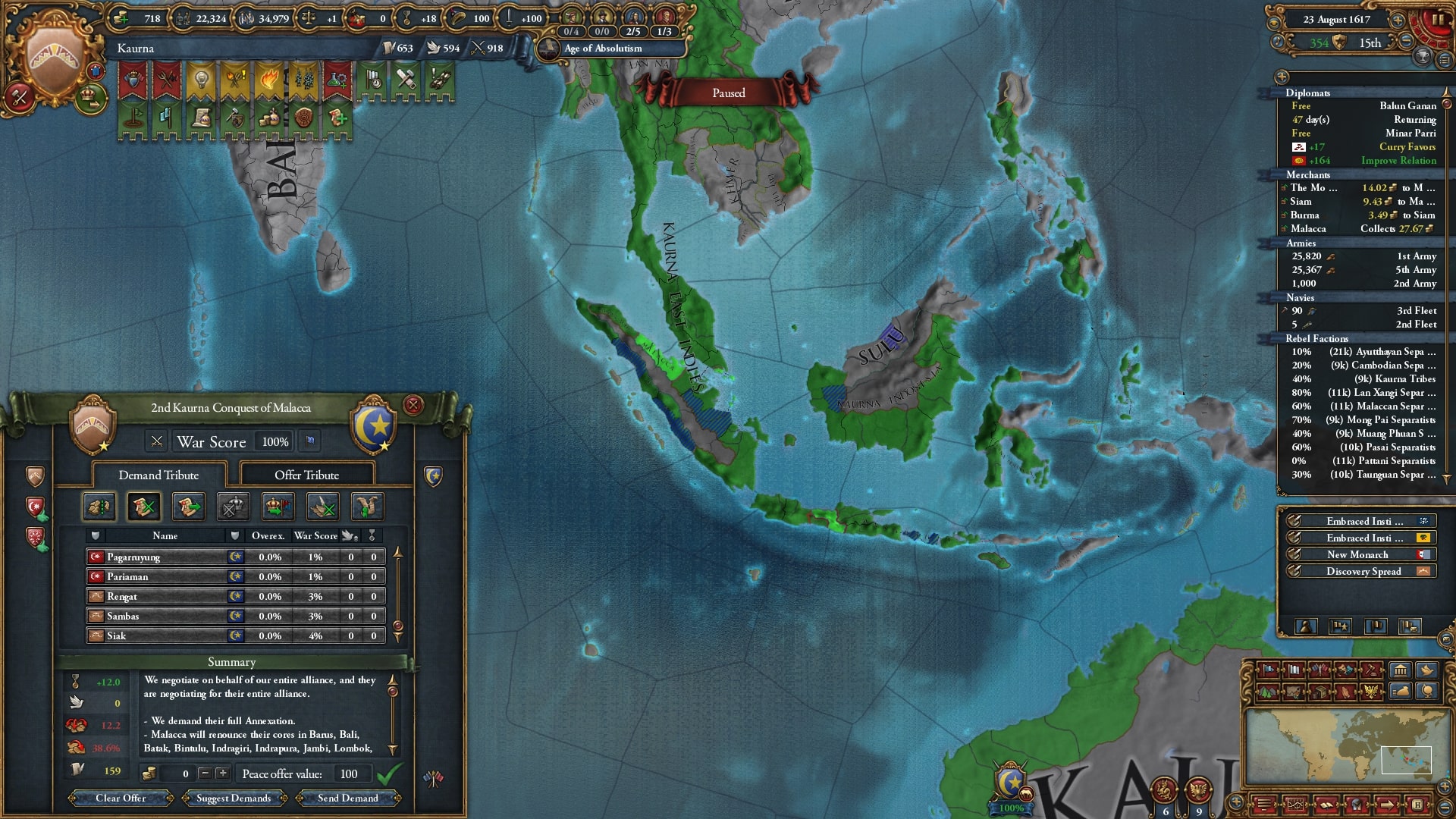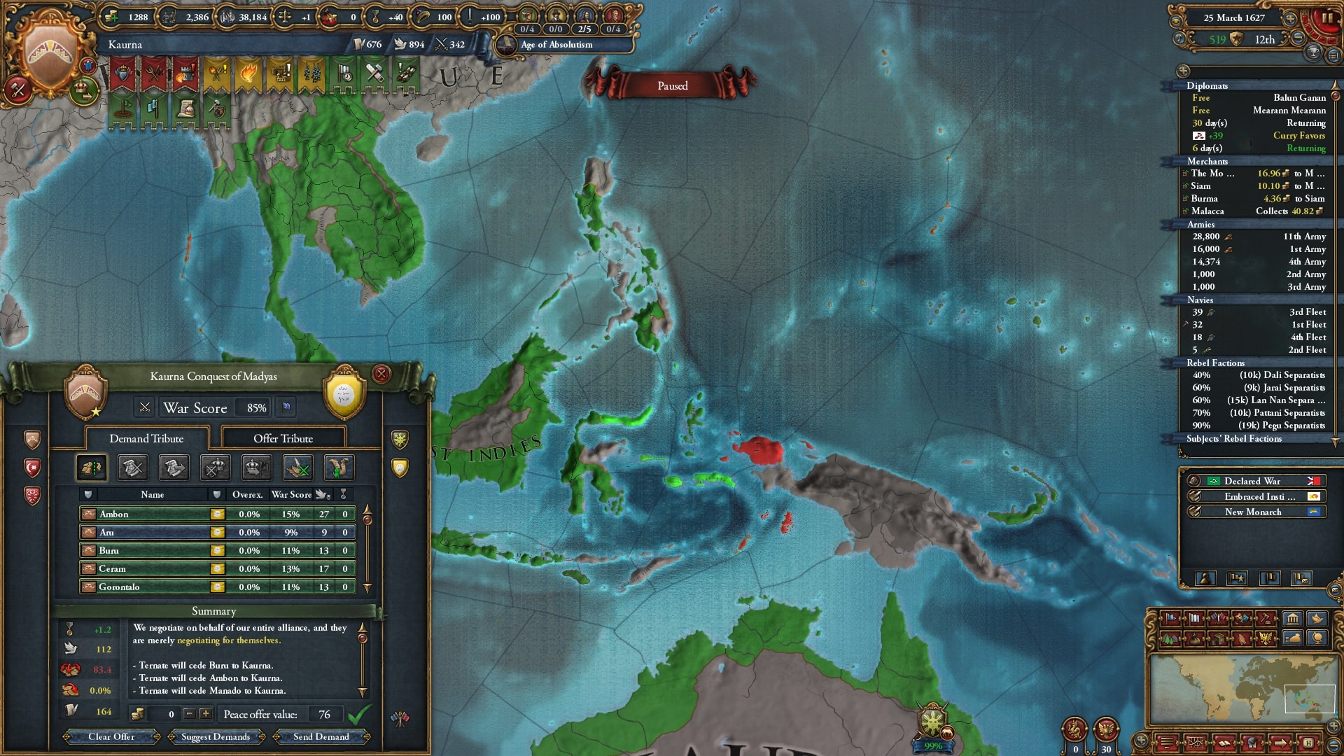 ラーンサーン戦中に探検アイデアを破棄し外交アイデアに変更。植民自体はマラッカノード/モルッカノードを中心にある程度は完了、残りは属国マジャパヒトと朝貢国テルナテにしてもらい、後から併合します。