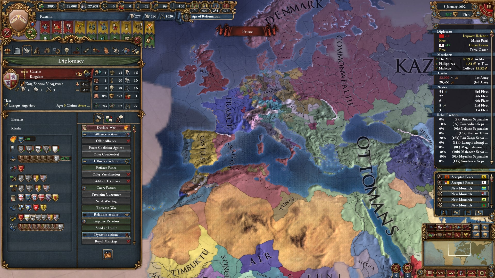 フランスの同君下位国となり併合が進んでいたカスティーリャですが、ここにきてオスマンの独立支援を受け独立戦争を開始。フランスに併合されると考えていただけにまさかの展開です。