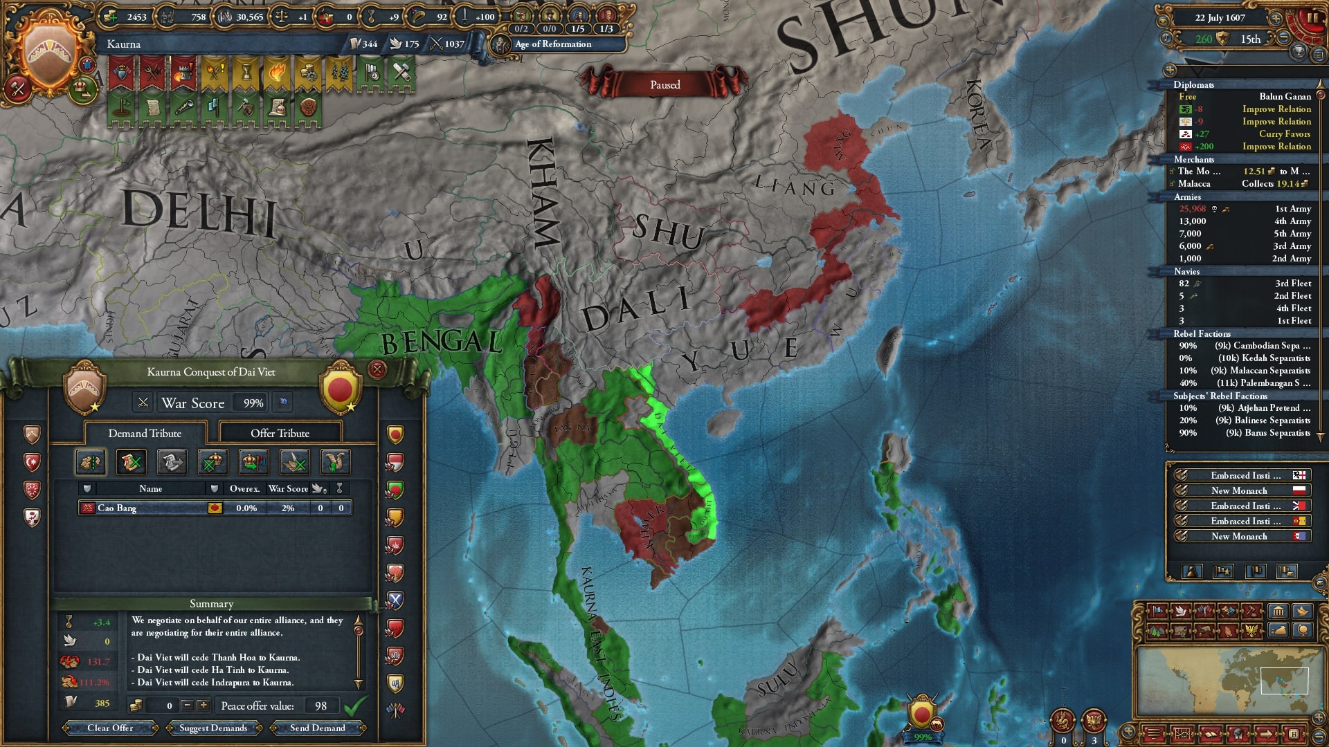 結局4年ほどはかかりましたが98点分の講和で大越/Dai Vietの領土をほとんど獲得しました。人的資源が枯れかけました。