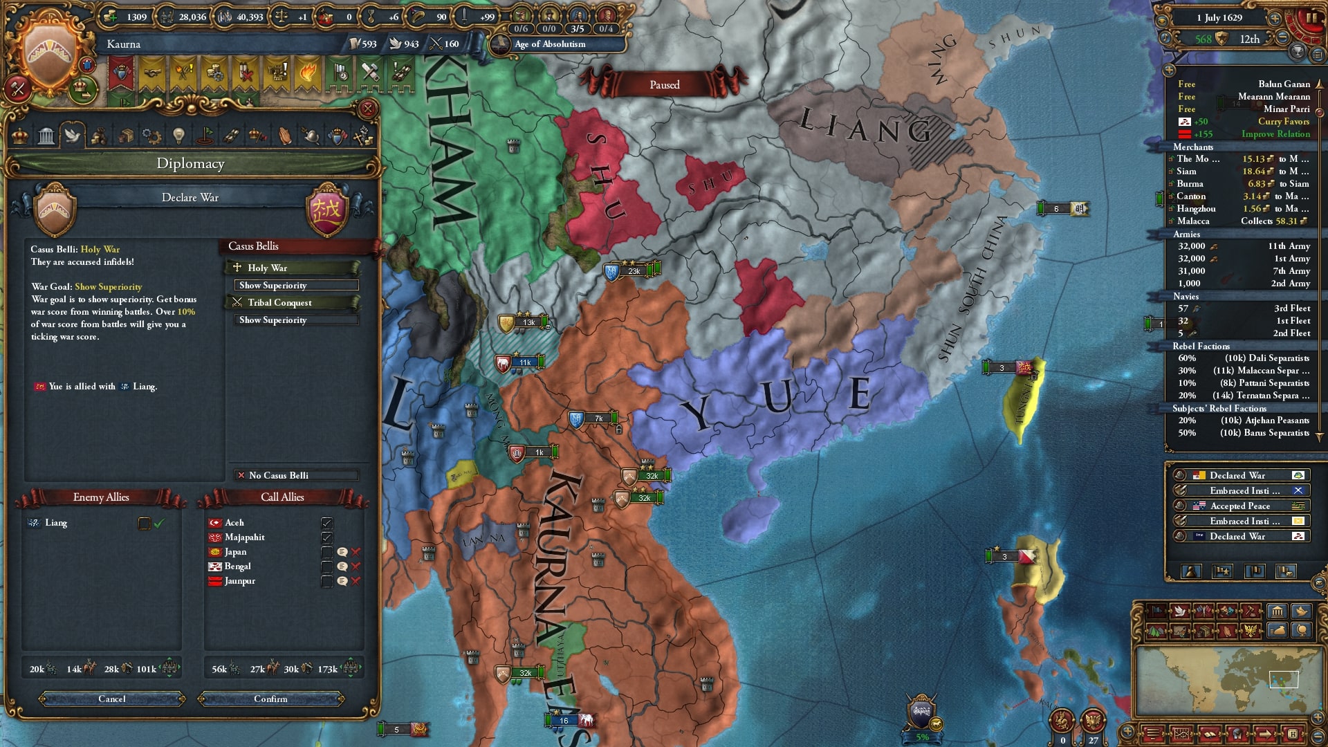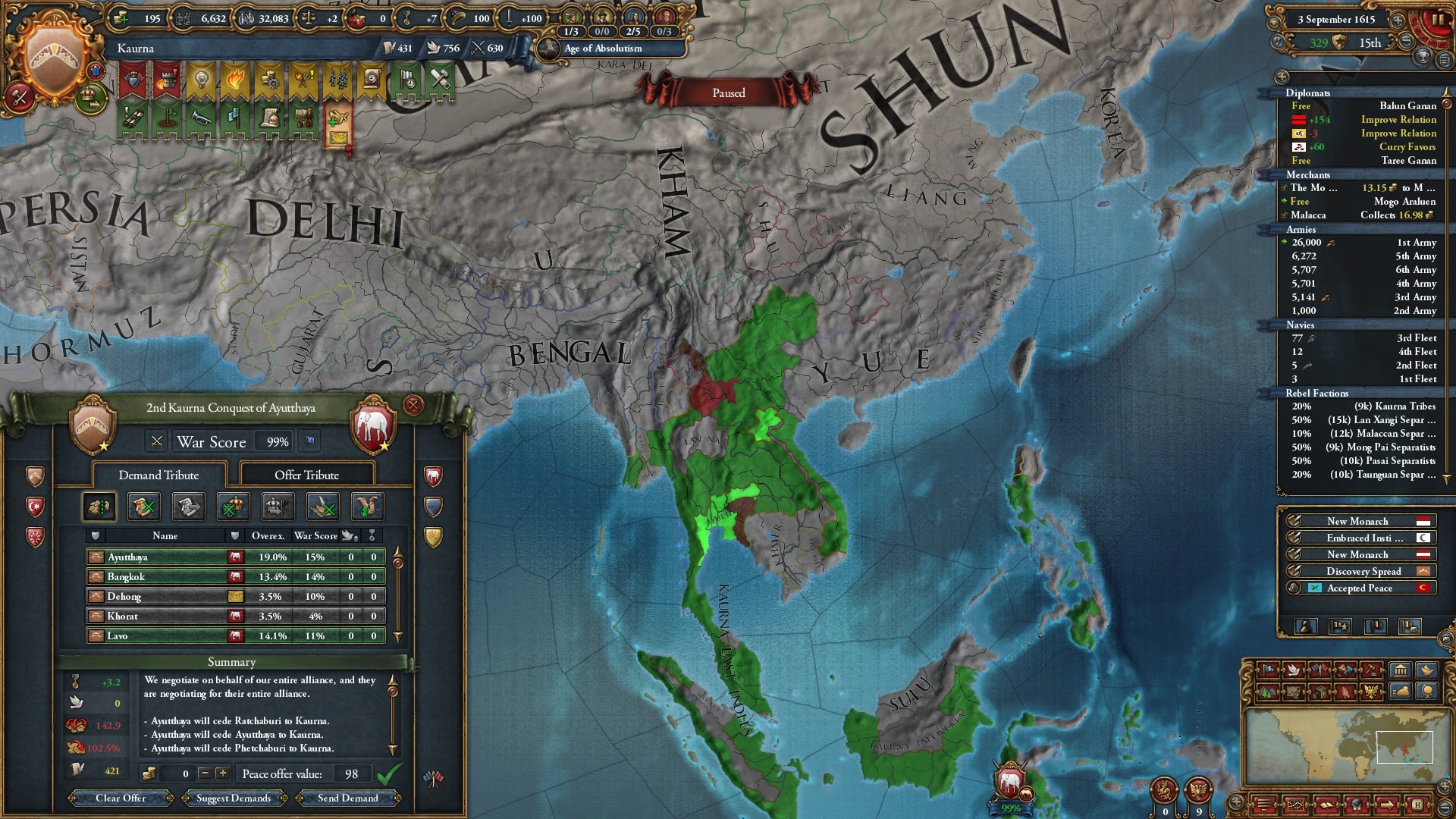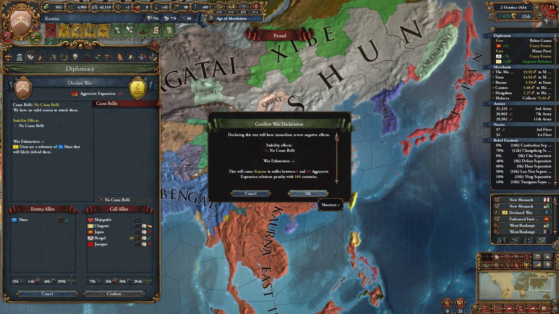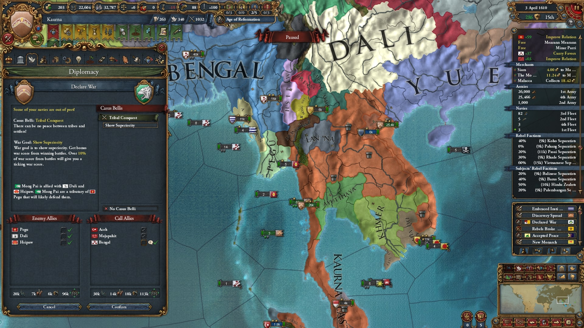 ついにユーラシア大陸側へと本格侵攻開始。まずはアユタヤ/Ayutthaya、同盟国ベンガルを呼び出して宣戦します。