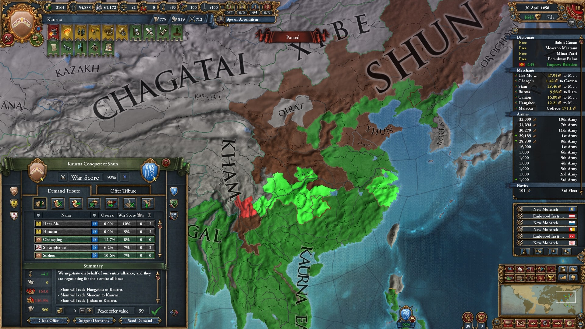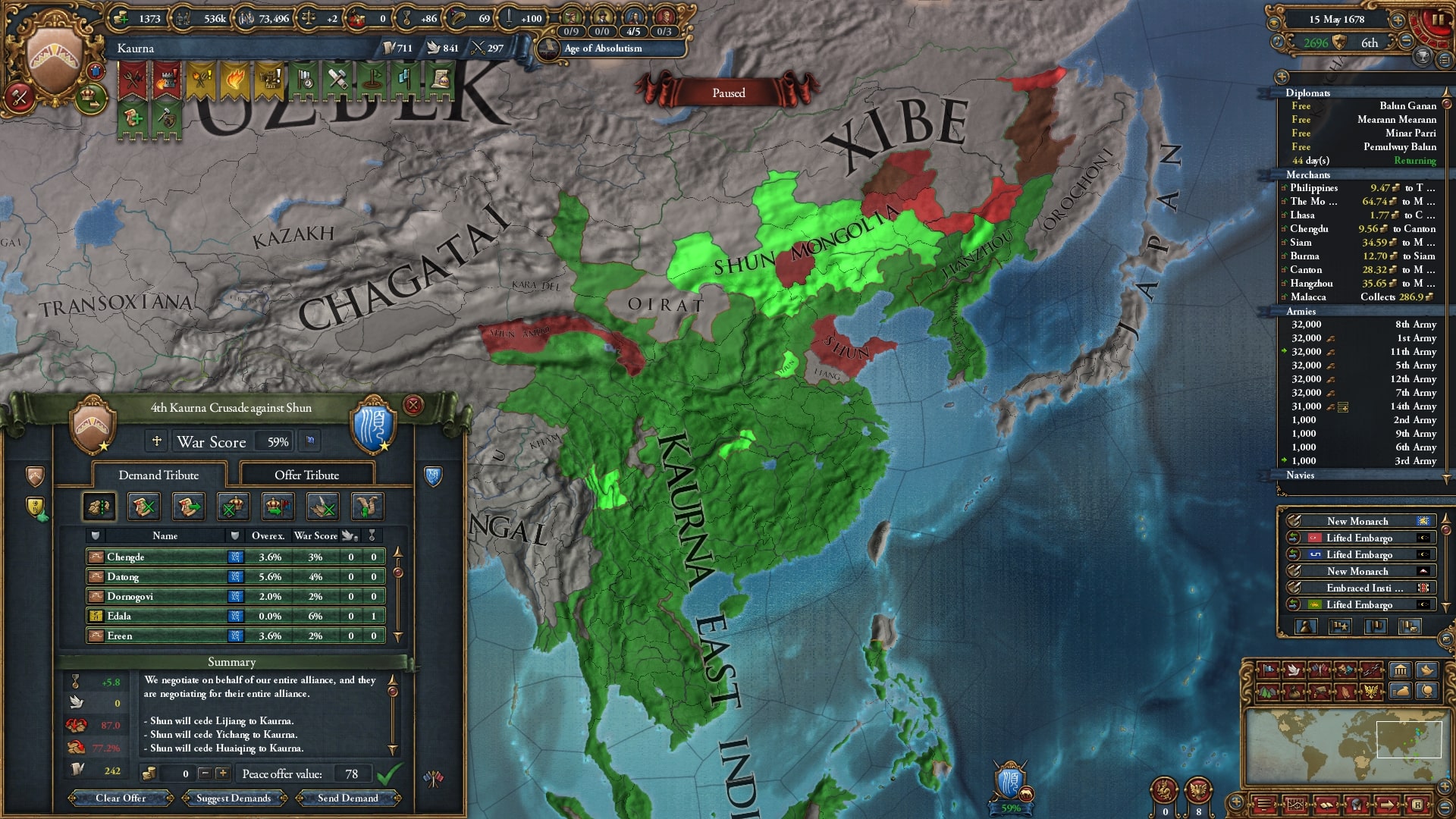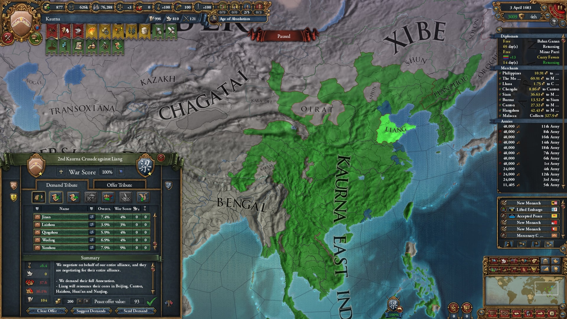 オイラトを使って停戦短縮していました。再びベンガルを連れて順に宣戦、中華皇帝位にようやく就いていたのもありさすがに余裕でした。なかなか領土が獲れないです。