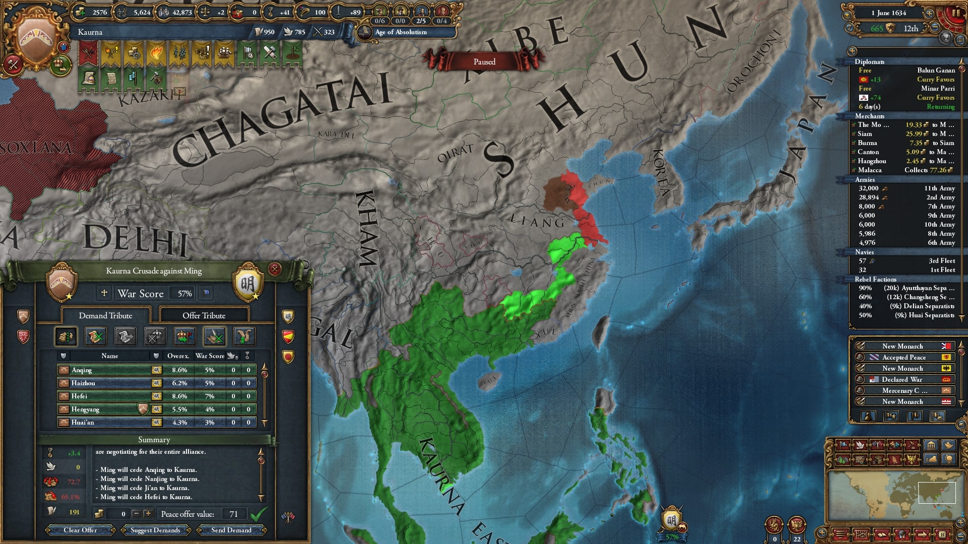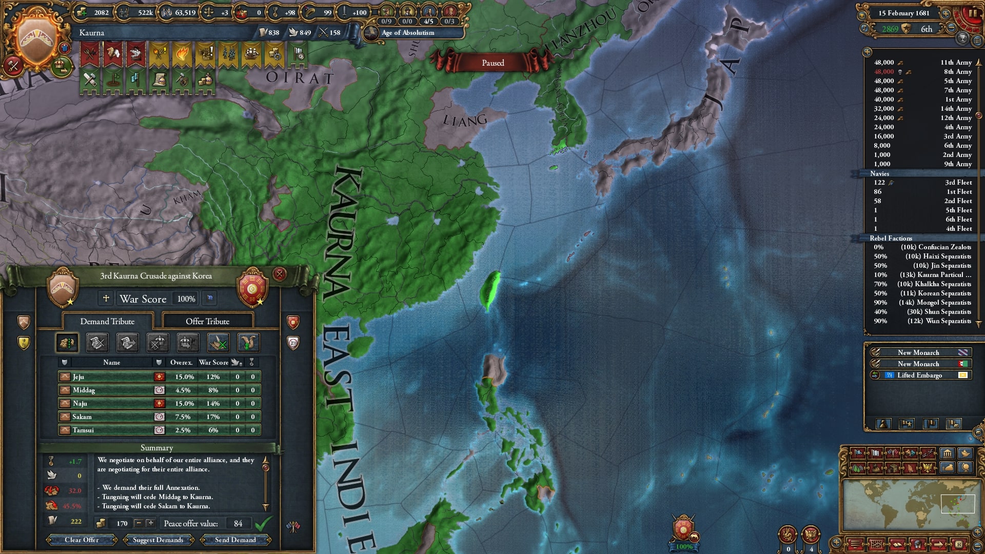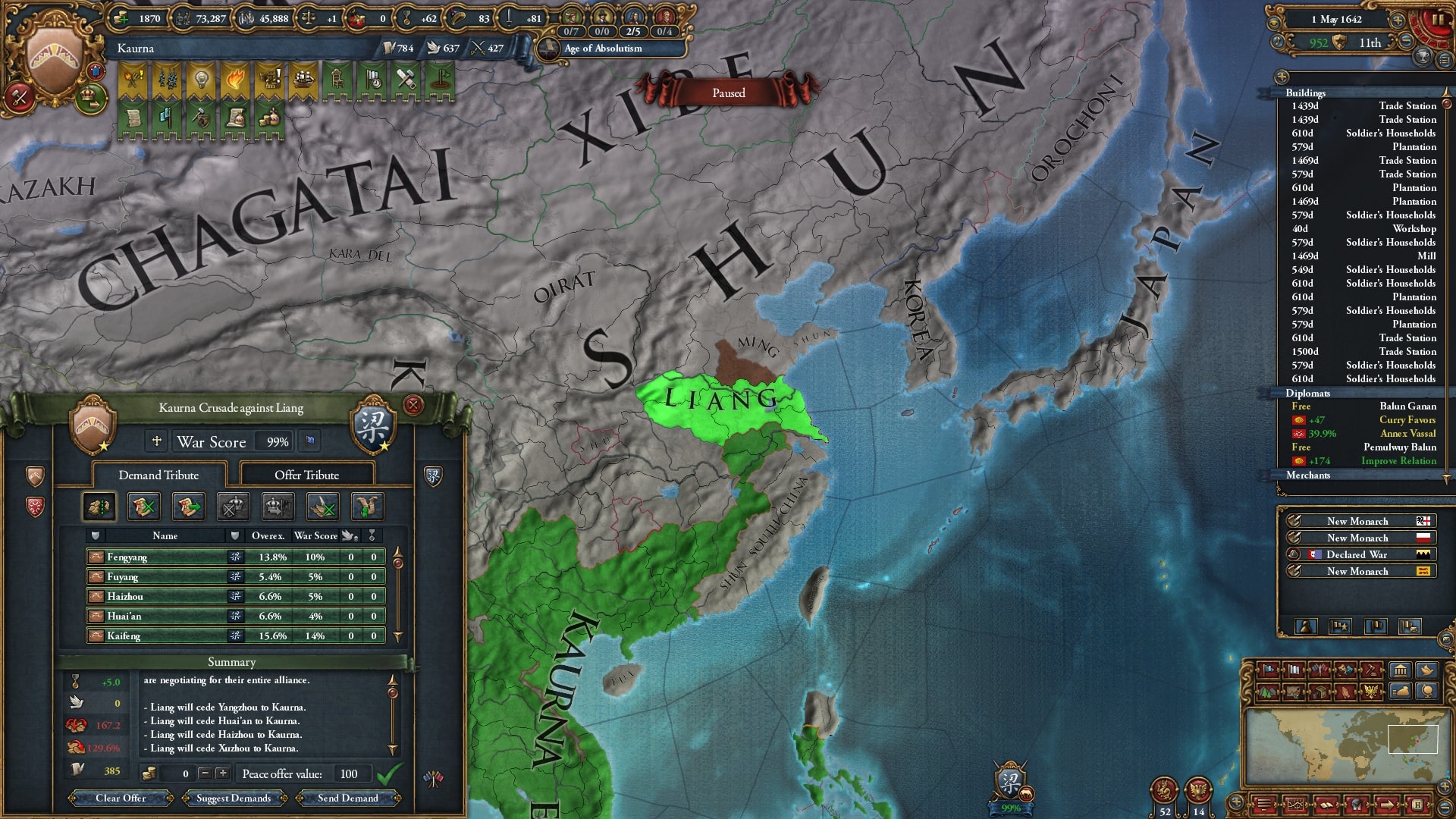 オイラトを使って停戦短縮していました。再びベンガルを連れて順に宣戦、中華皇帝位にようやく就いていたのもありさすがに余裕でした。なかなか領土が獲れないです。
