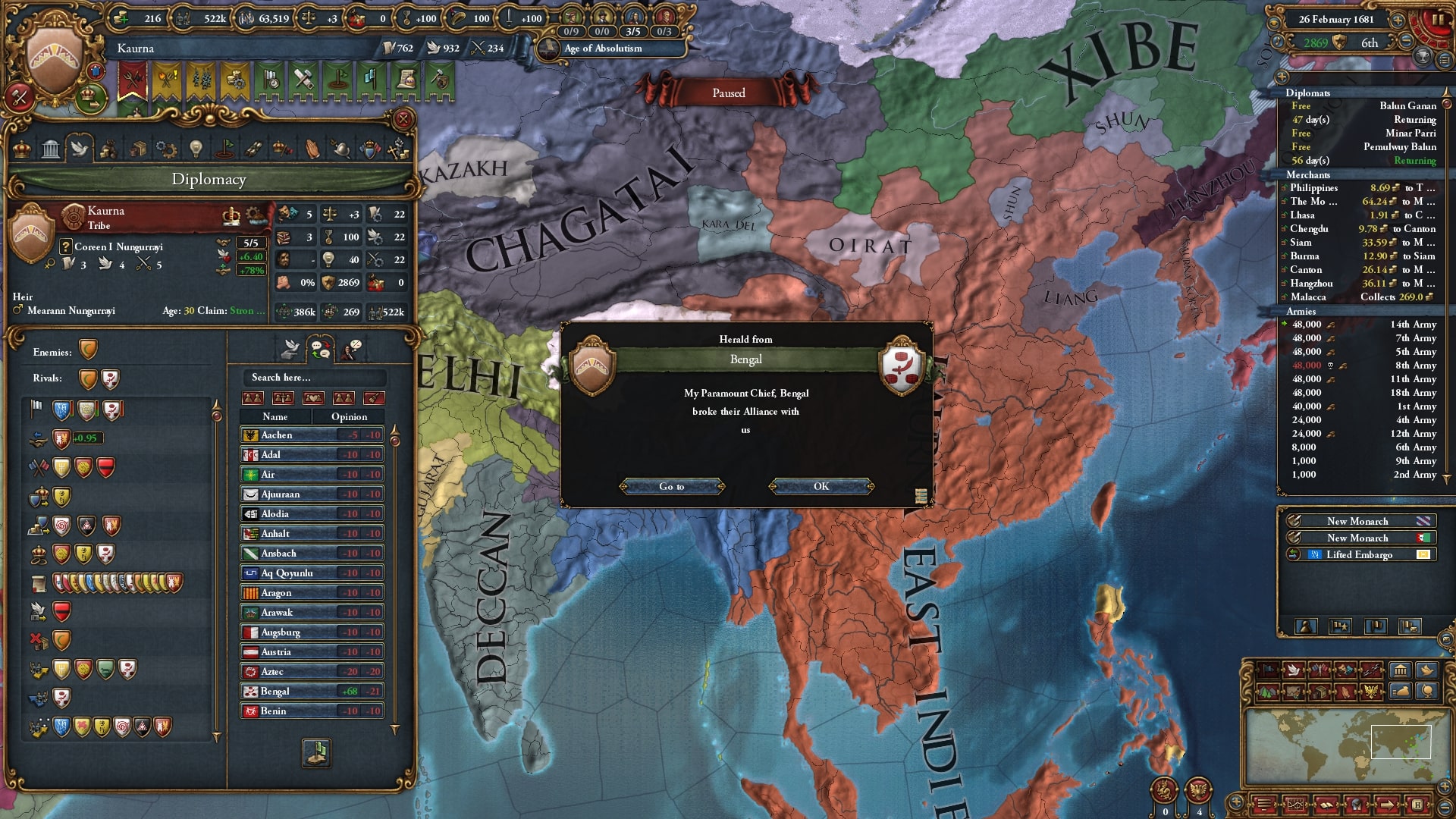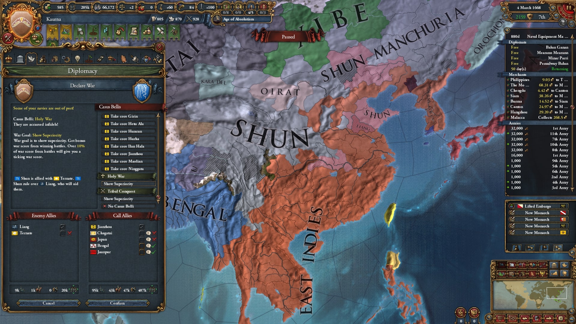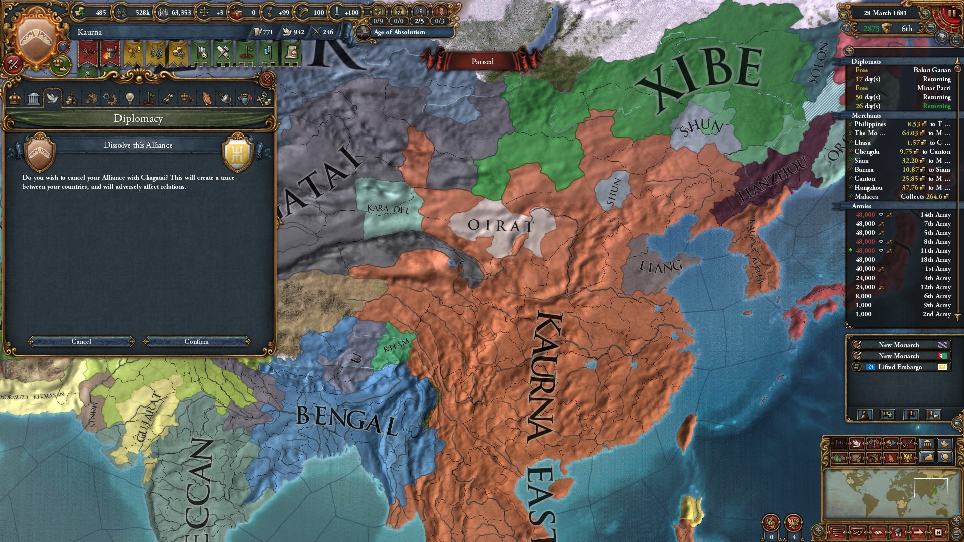 本格的な中華侵攻に入ります。停戦明けの順に宣戦、ベンガルと同盟済みのチャガタイ/Chagataiを呼びだしました。
