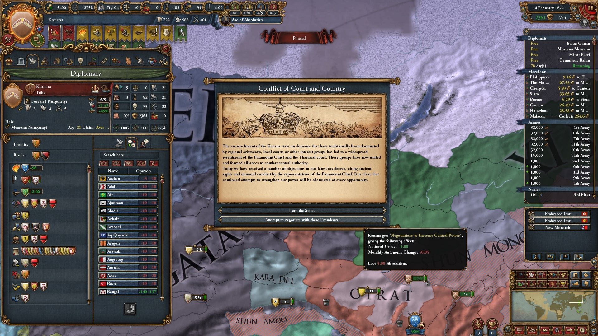順戦後すぐに順に停戦破棄で攻め込み、国難の発生条件を満たしていました。本プレイではさすがに国難を利用しないと最大絶対主義の値が厳しめです。ラッシュに間に合うように1672年に国難開始。