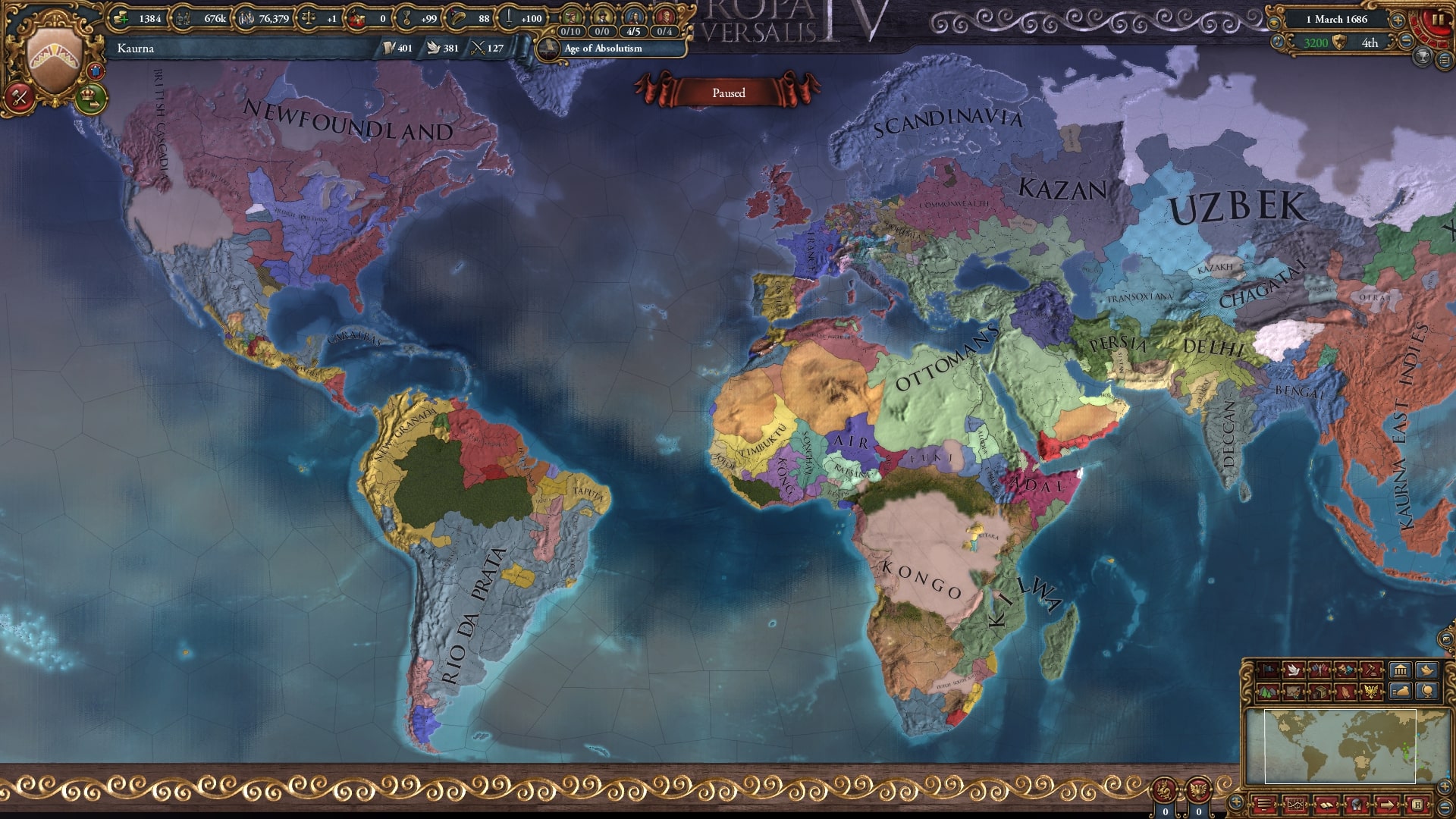 前回と比較すると、オスマンに攻められたコモンウェルスは完全に没落。植民地国家を持つ西欧4ヶ国が安定的に列強入りしています。カスティーリャが一時的に同君下位国であったこともあり、飛び抜けて多くの植民地国家を持っている国家は存在しません。若干多めの支配領域を北米に持っている抑えているグレートブリテンの出力だけ気になるところでしょうか。