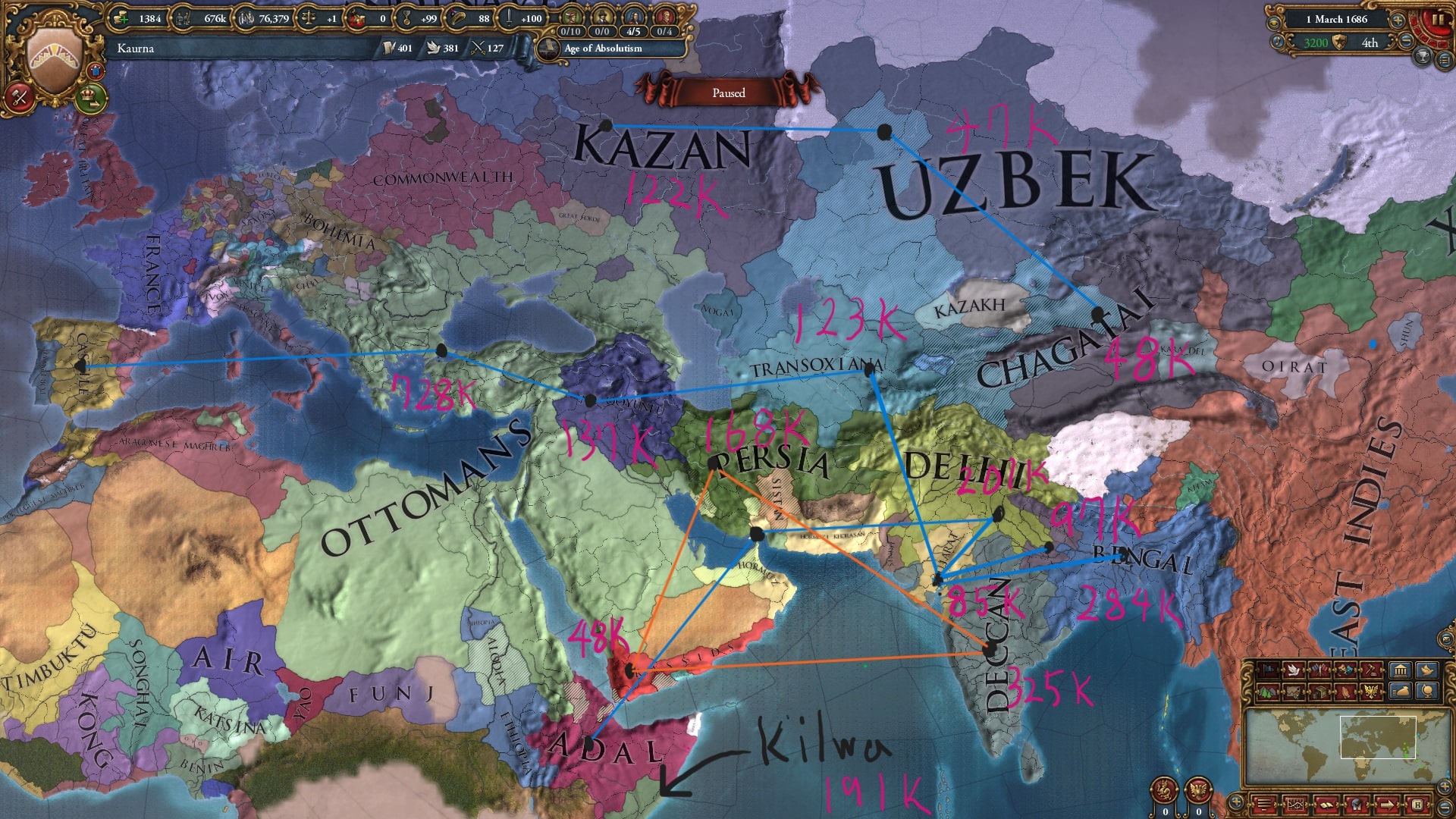 同盟網は複雑で強固...と思いきや実際はそうではなく、比較的ゆるい同盟関係であり、非常に攻めやすいです。気掛かりなのはシーア派国家同士で同盟しているデカンとペルシア/Persia、独立戦争からの同盟が続いているオスマンとカスティーリャくらいでしょうか。