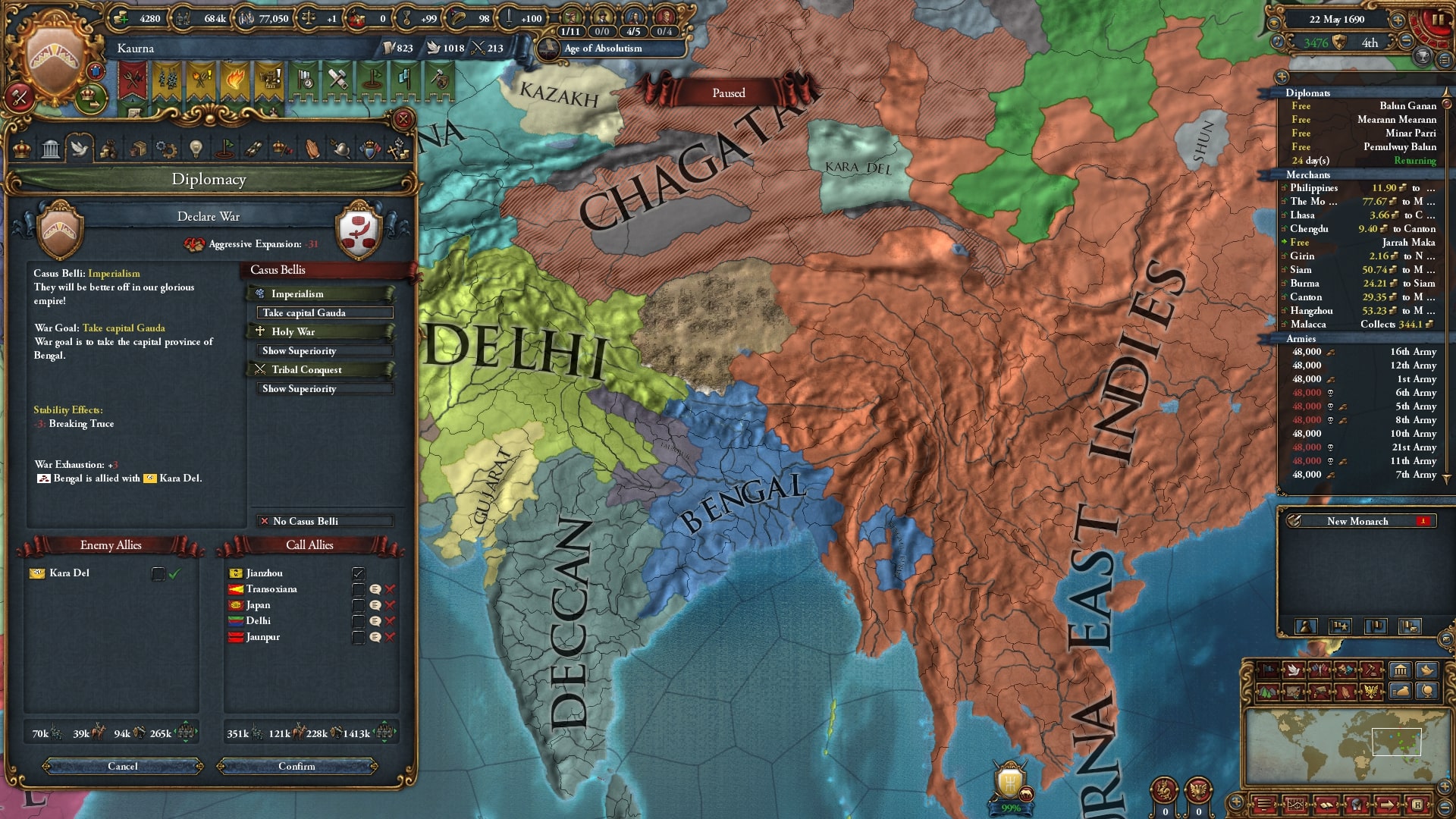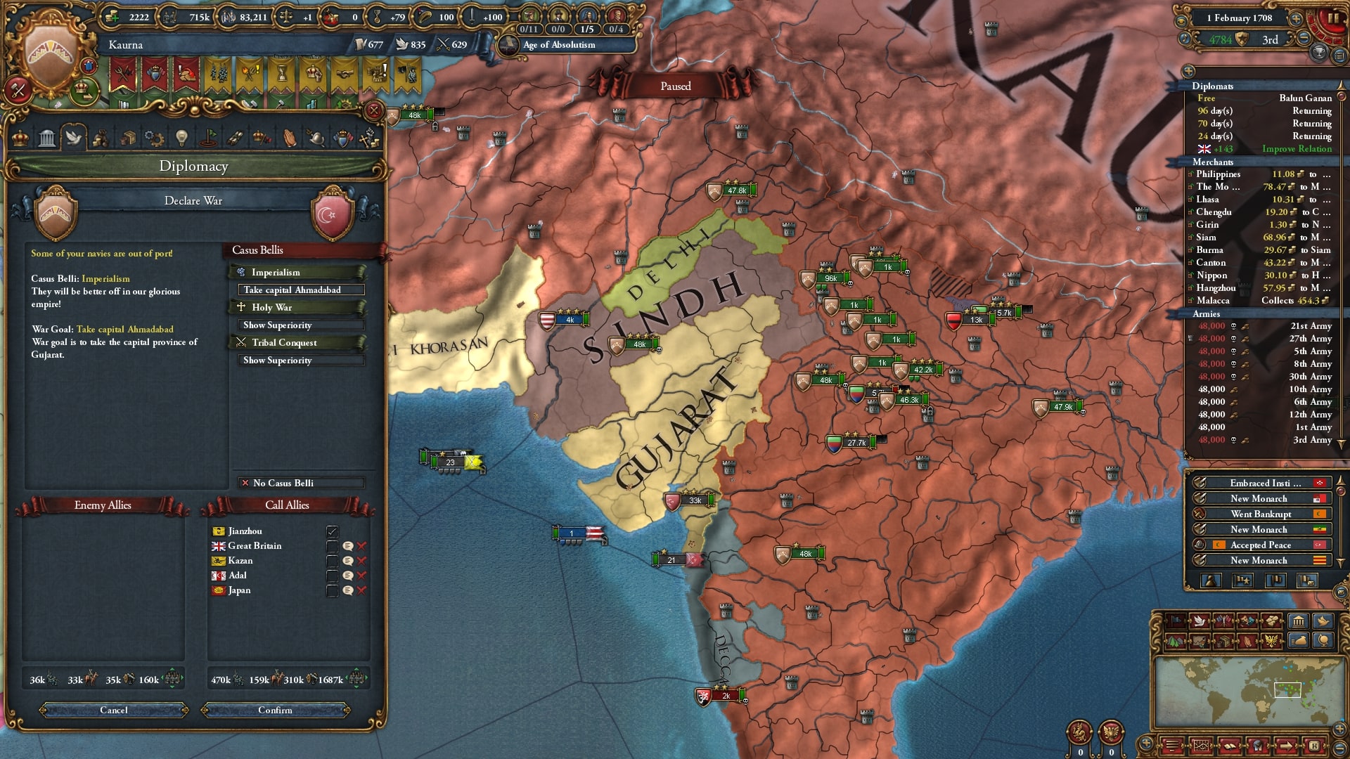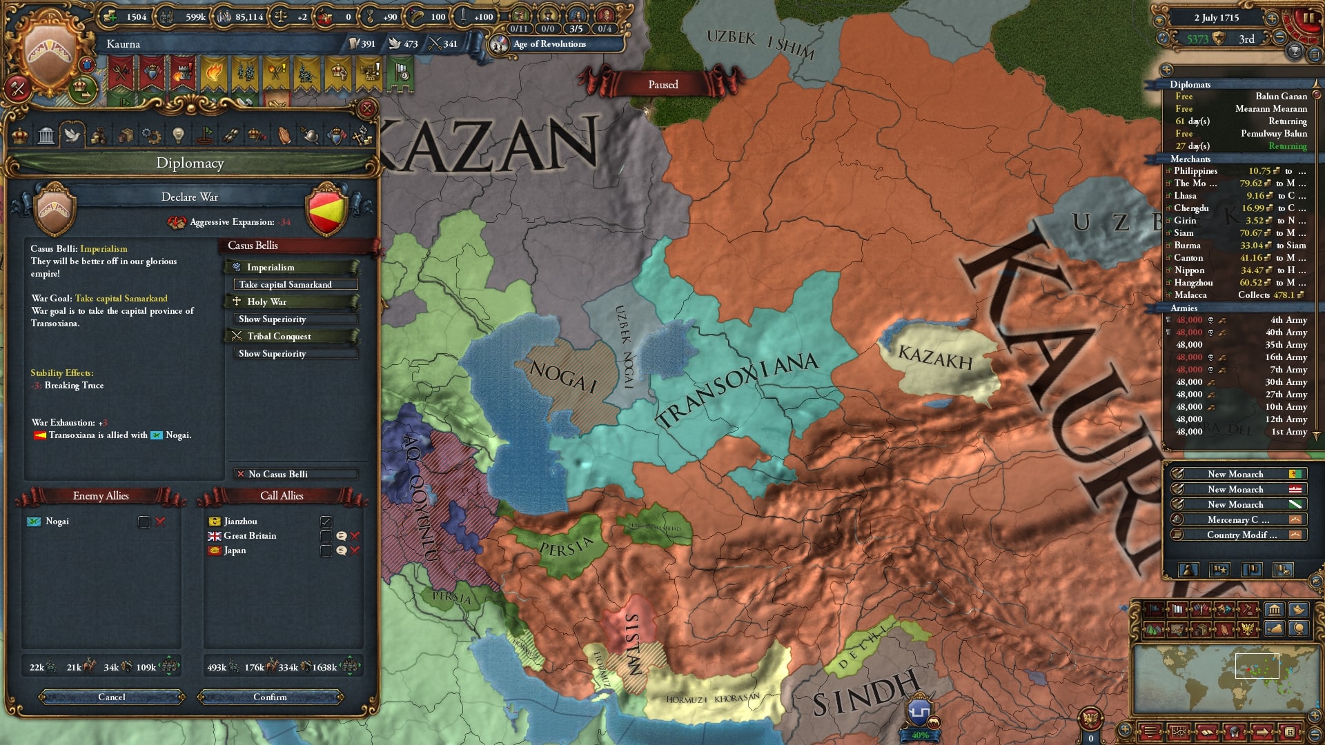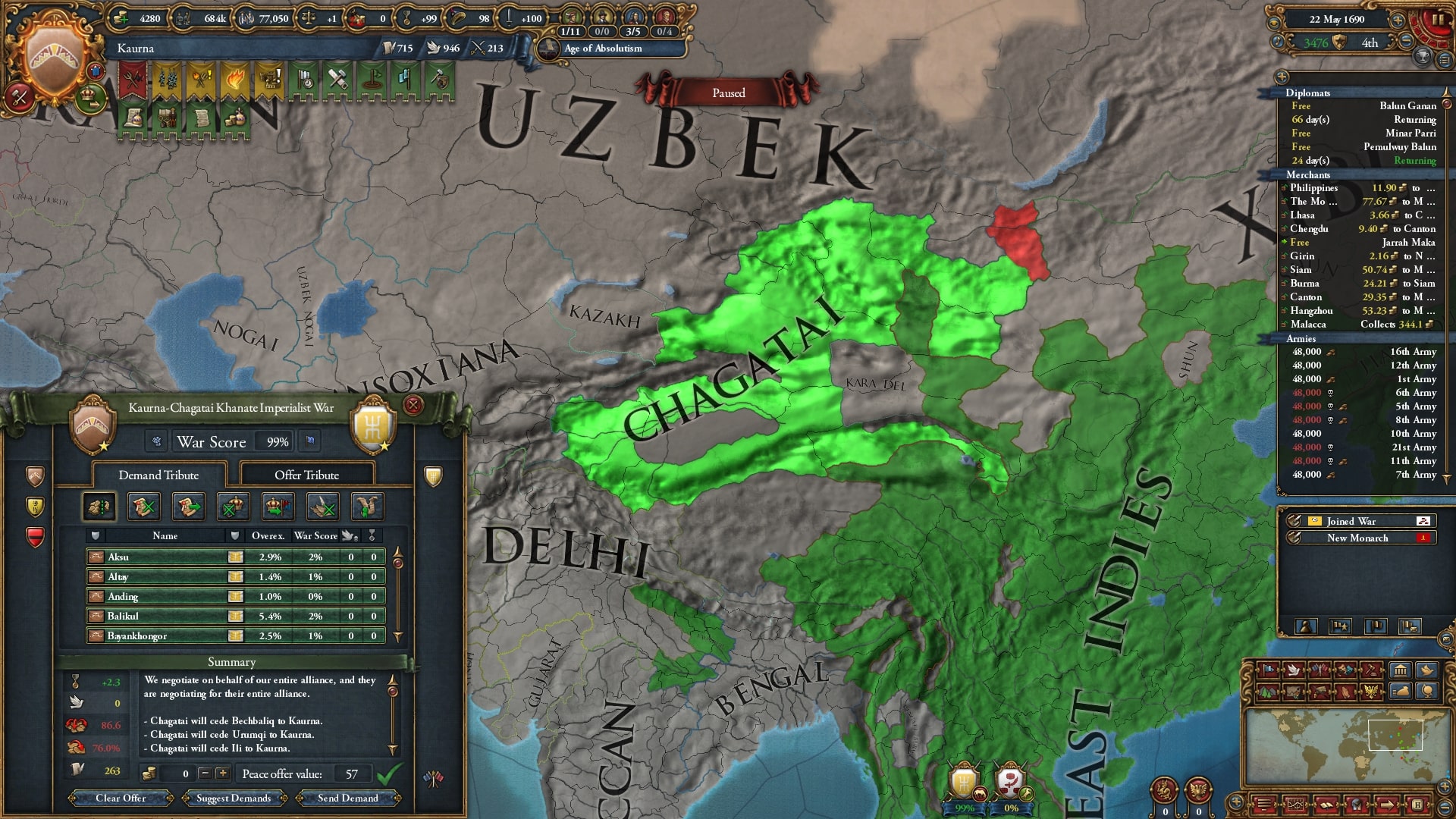 今の同盟のうち、日本を除くジャウンプル・デリー・トランスオクシアナは攻撃用の同盟という目的以上に、AE圧縮・同盟破棄後の5年間の停戦期間目的の方が強かったりします。外交点は大量に余っているので、これ以降も様々な国家と同盟しつつAE/停戦の管理を行っています。