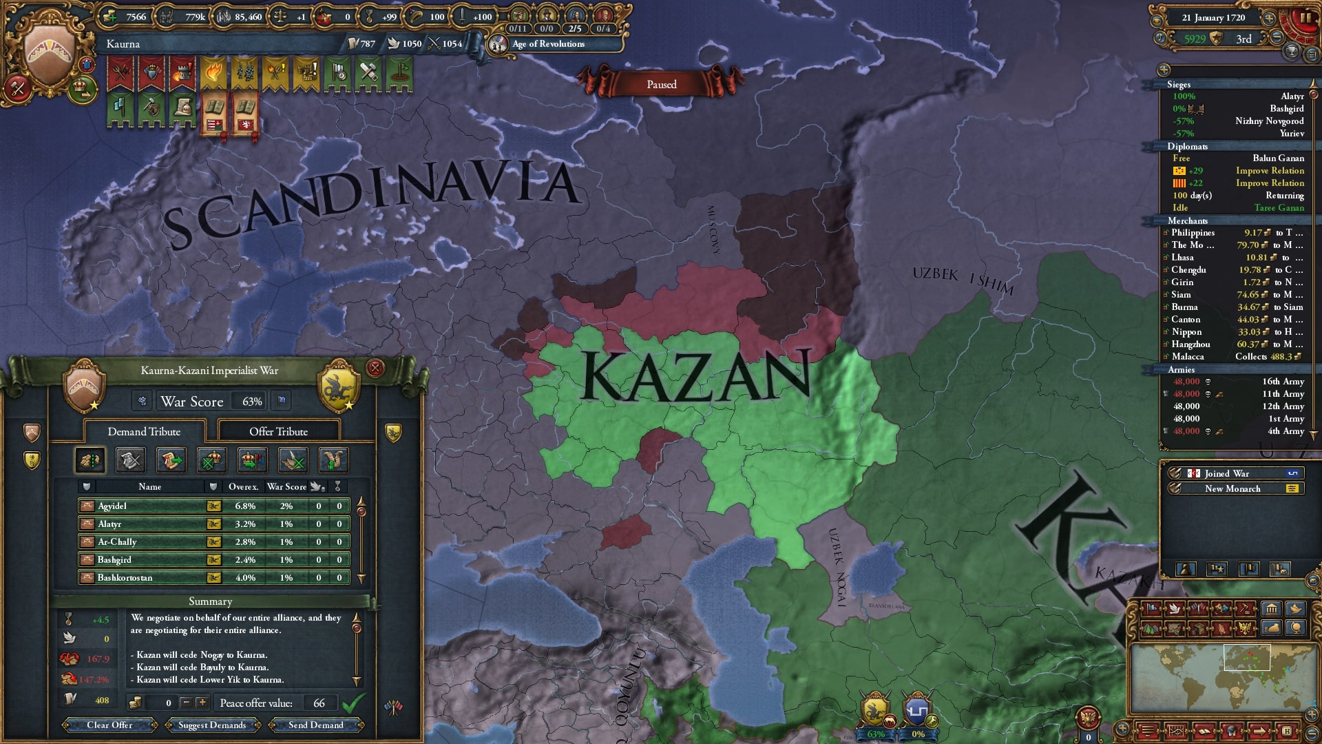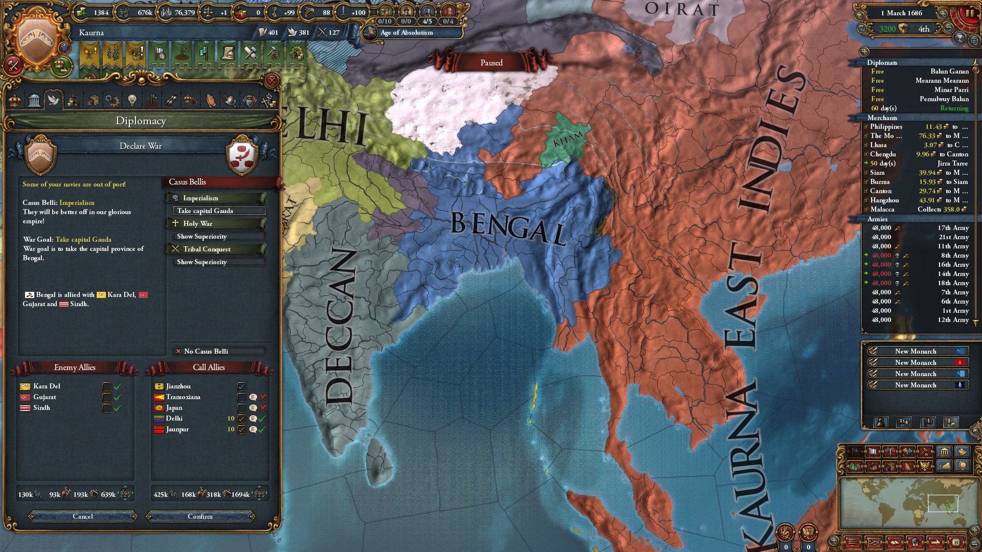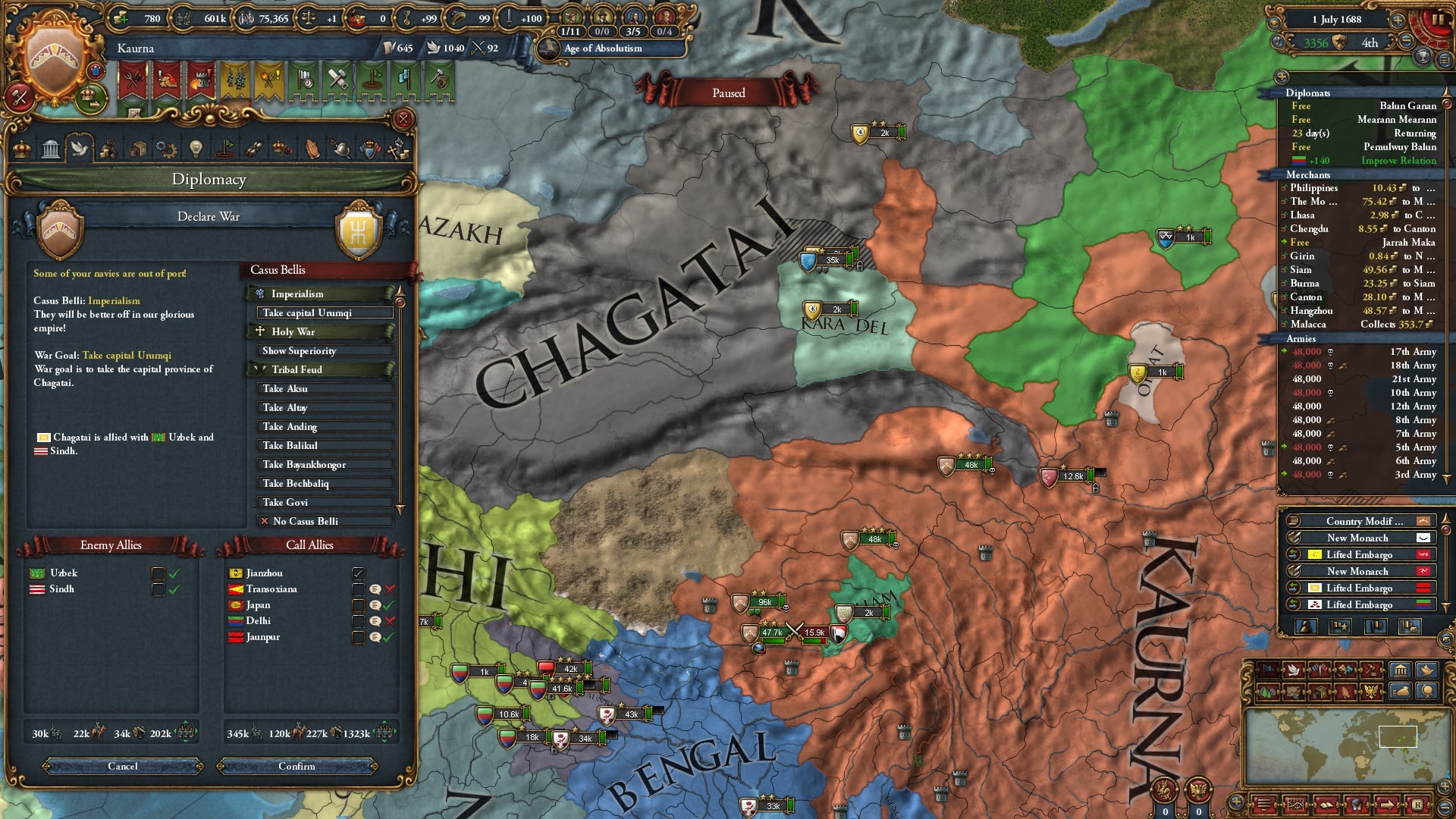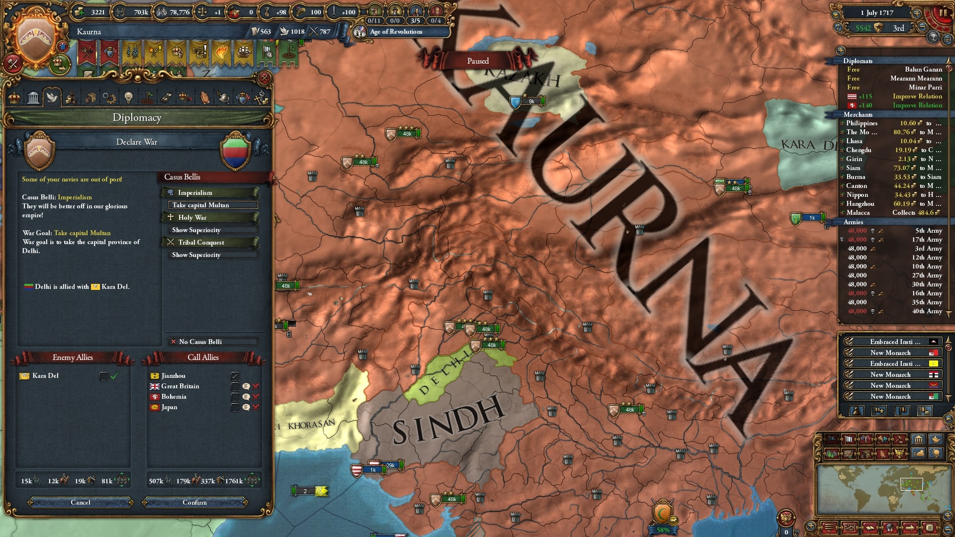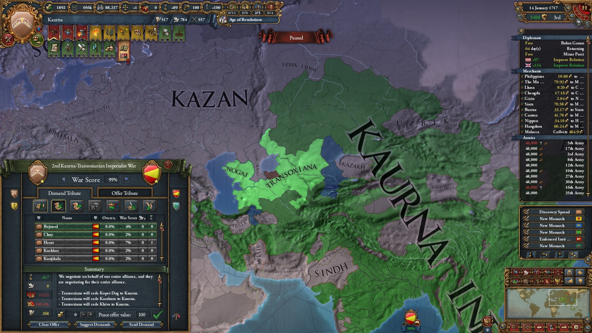 今の同盟のうち、日本を除くジャウンプル・デリー・トランスオクシアナは攻撃用の同盟という目的以上に、AE圧縮・同盟破棄後の5年間の停戦期間目的の方が強かったりします。外交点は大量に余っているので、これ以降も様々な国家と同盟しつつAE/停戦の管理を行っています。