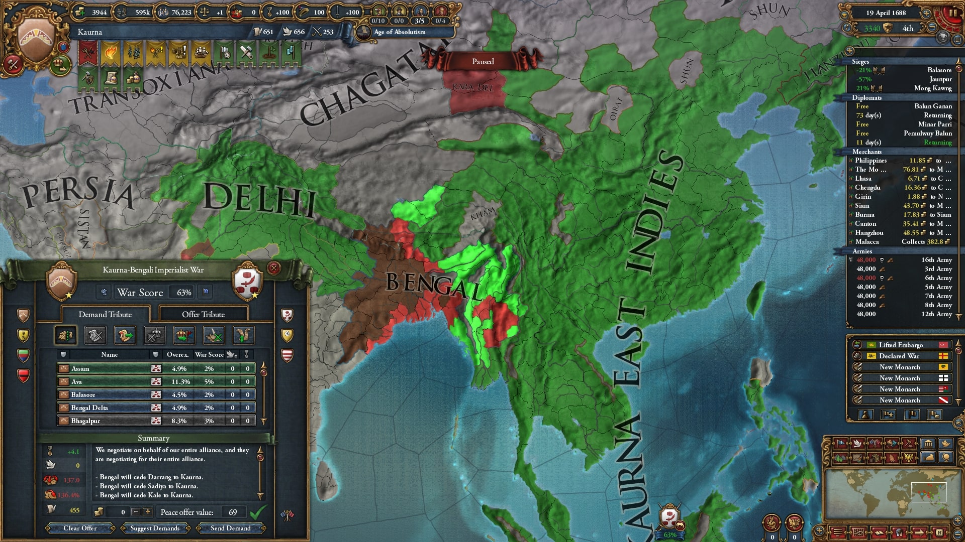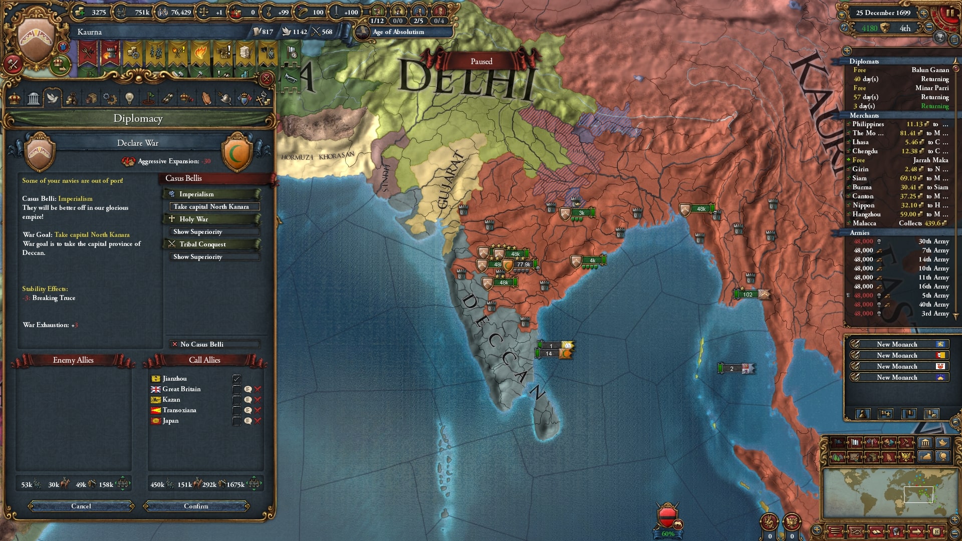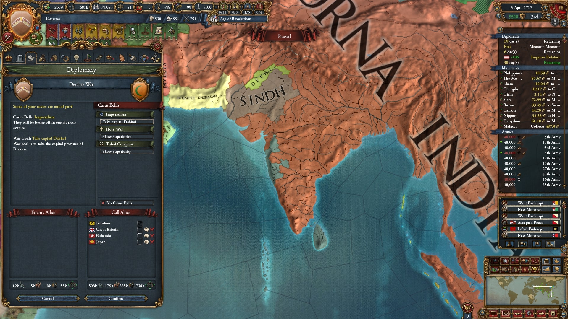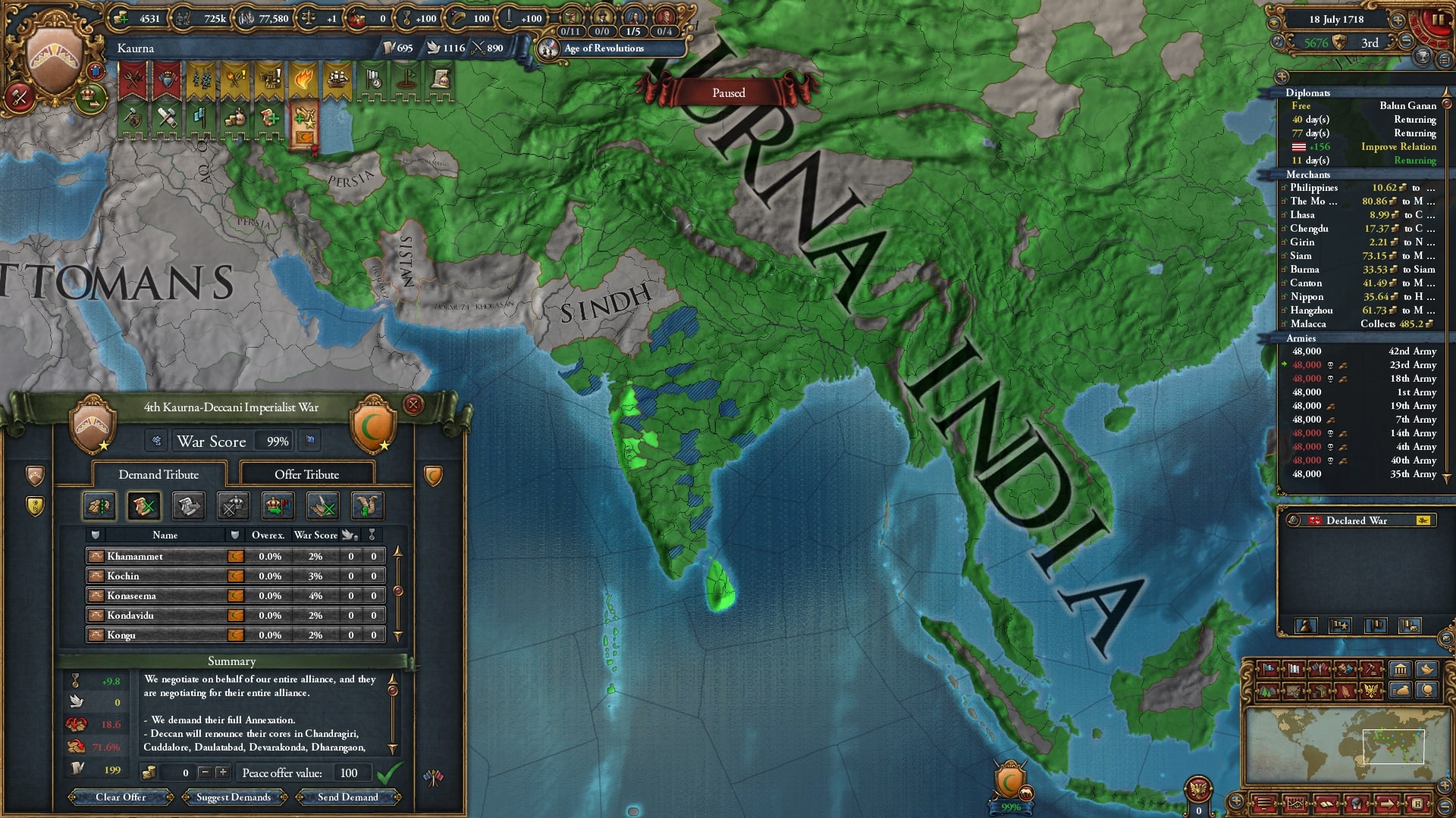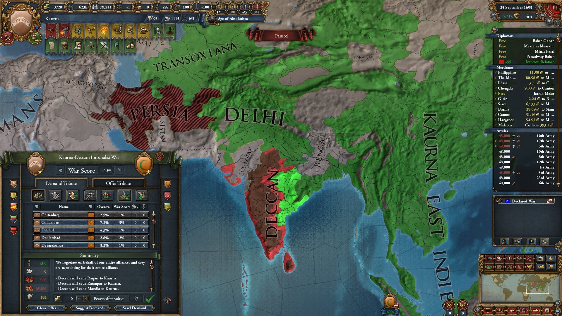 とりあえずペルシアとの同盟を切らせることには成功、後は停戦破棄でデカンをゴリゴリ削るだけ。