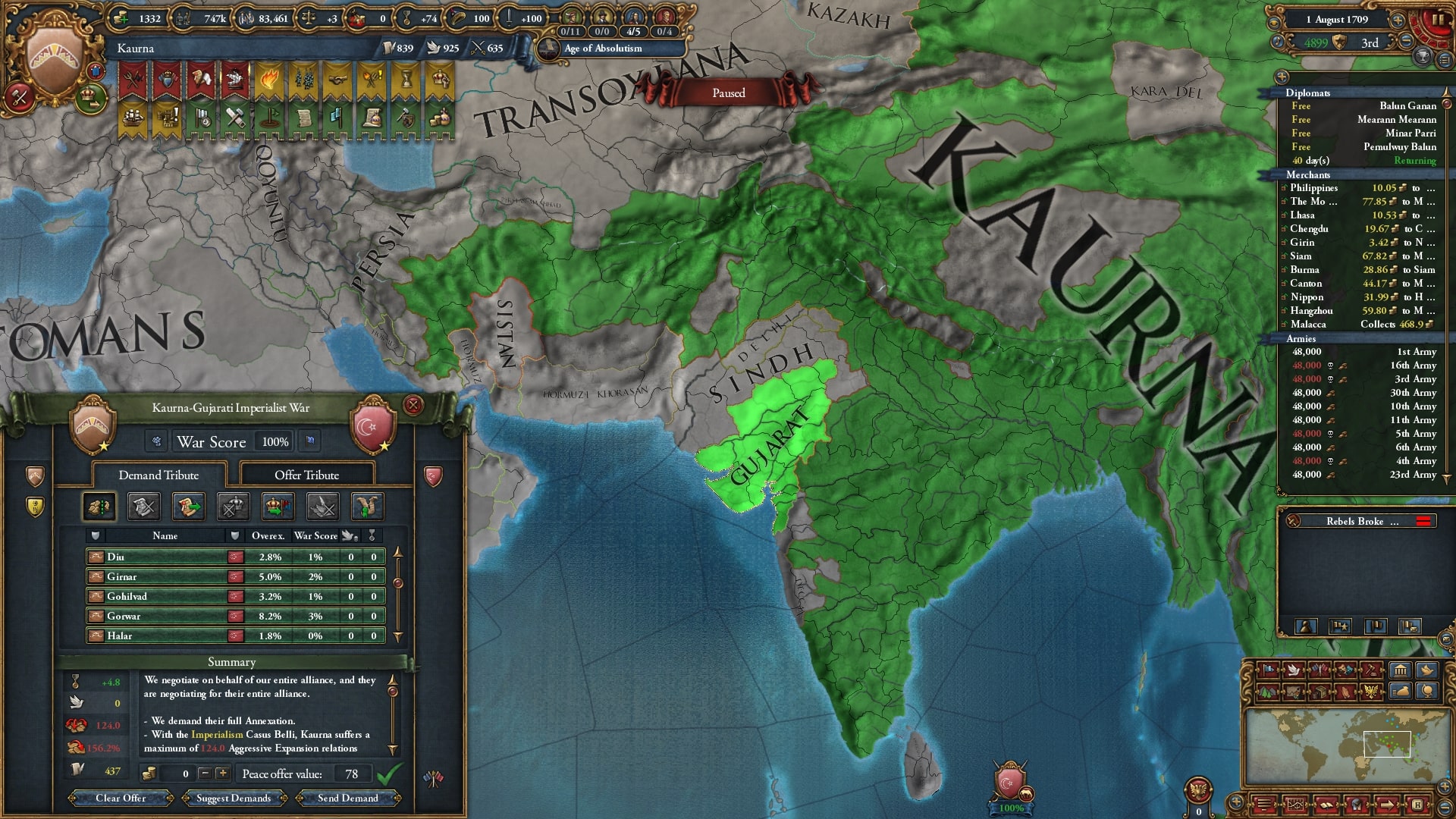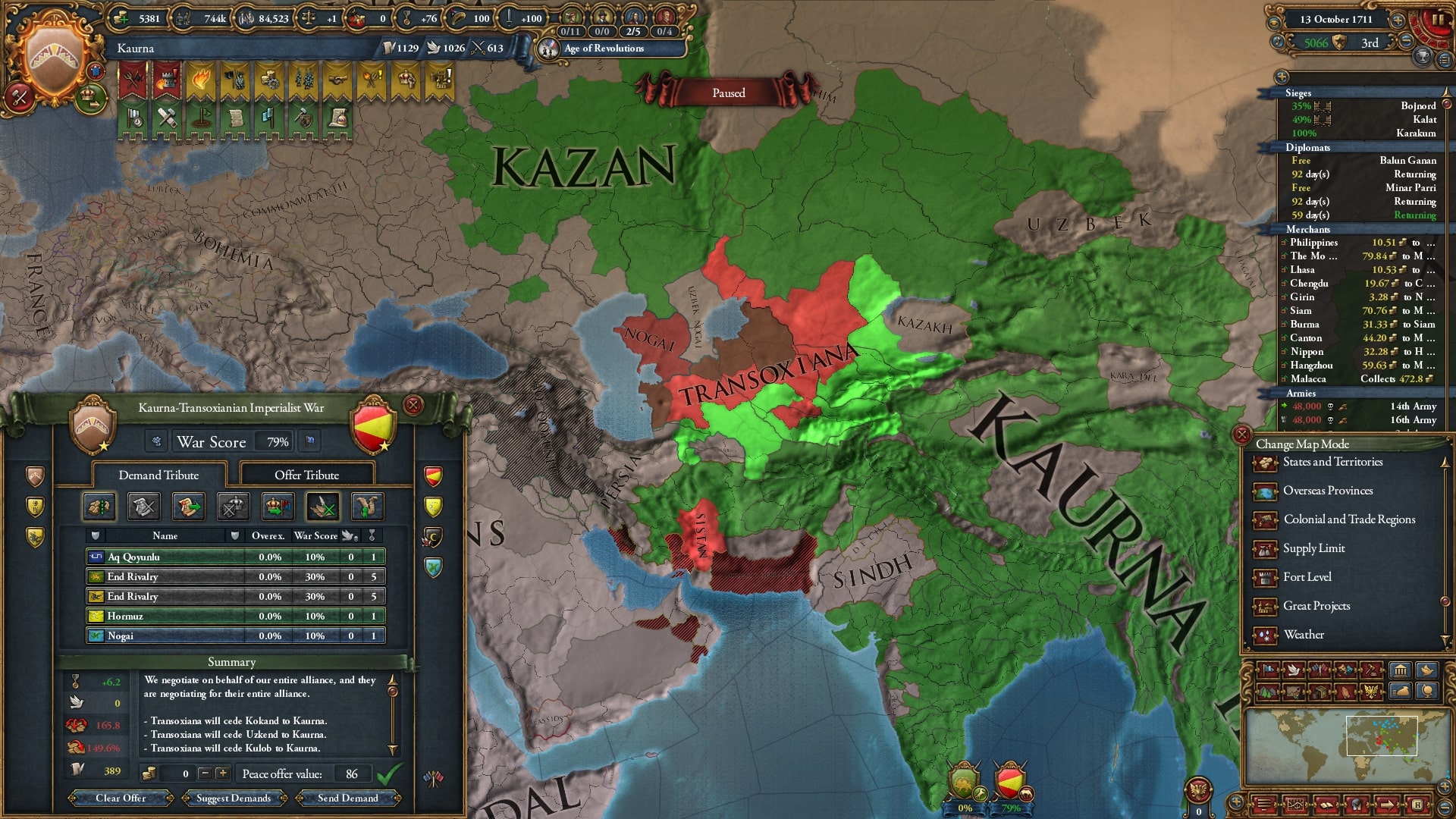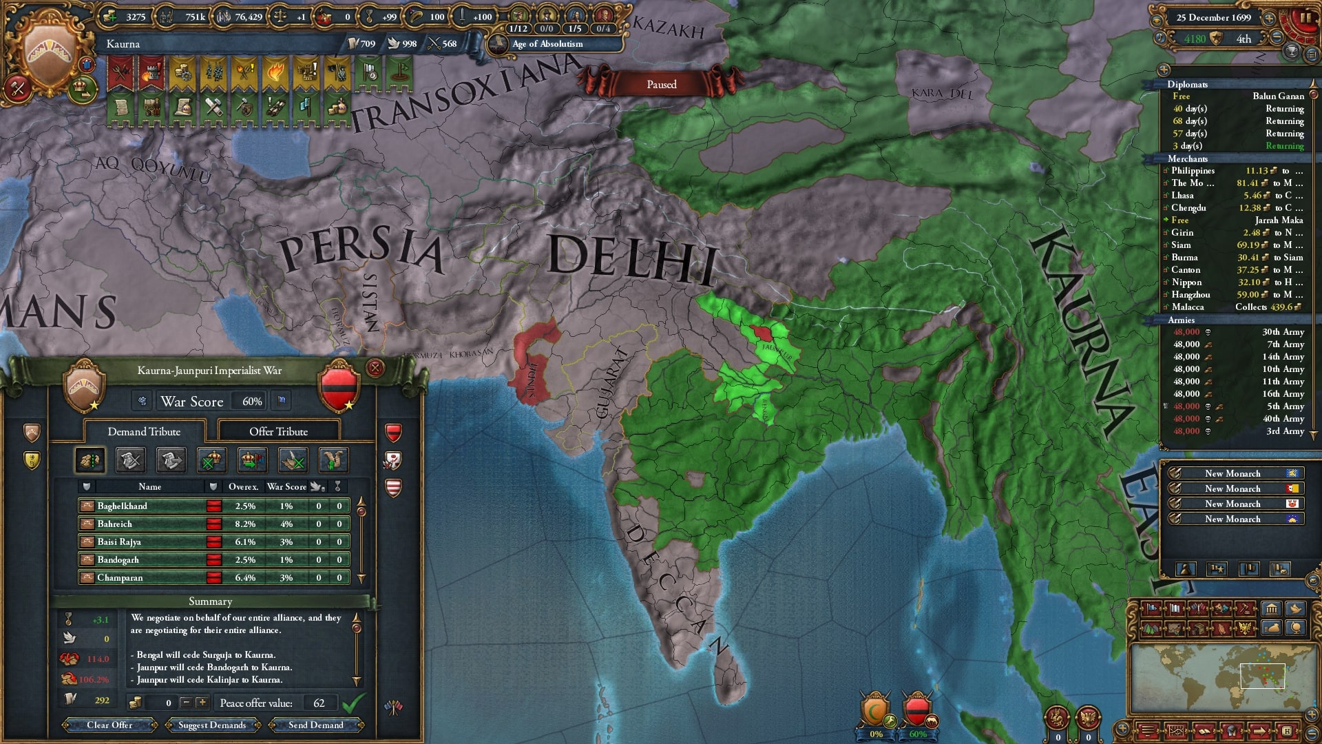 面倒なシーア組、デカン&ペルシアを同盟国連れて崩す目的でした。たださすが1.36ペルシアと言ったところでしょうか、トランスオクシアナ&デリーが押し返され、戦勝点がたまらないので最低限で早々に講和することに。