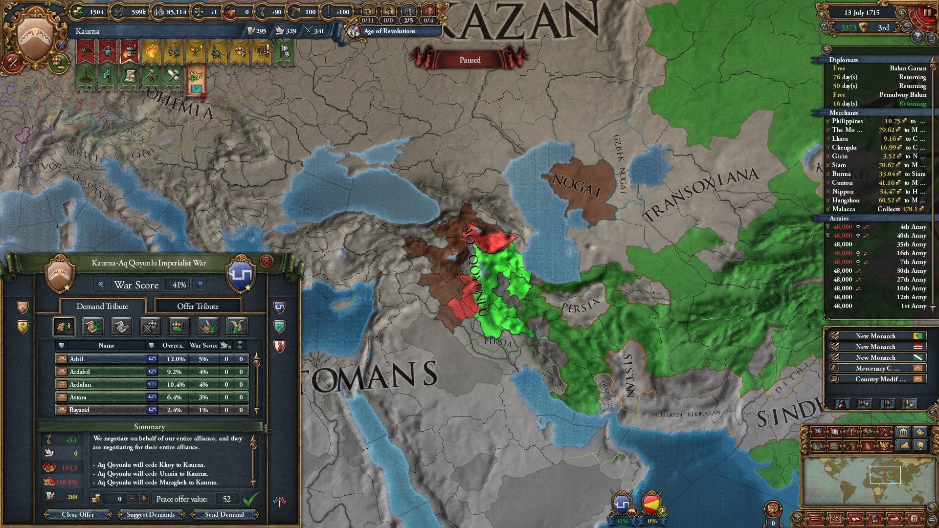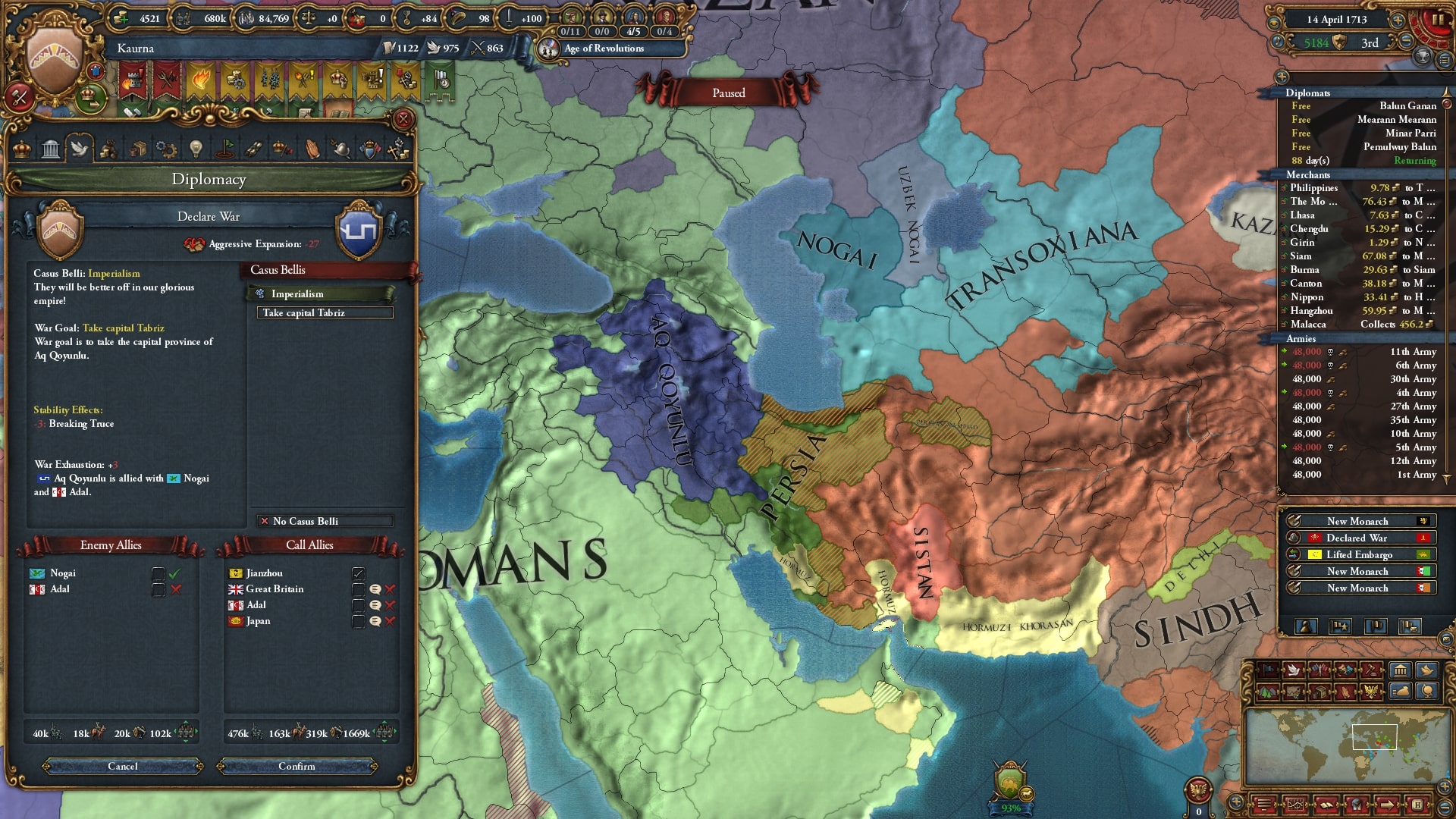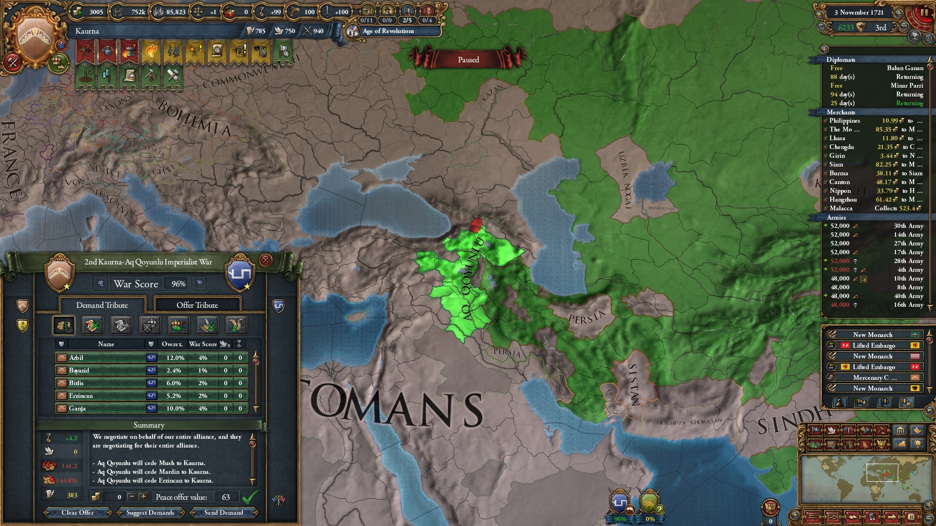 オスマンと白羊朝の同盟は1702年頃にオスマンが白羊朝の同盟国に攻めたことで外れていました。停戦期間が切れる前に白羊朝の併合までもっていきたいところ。