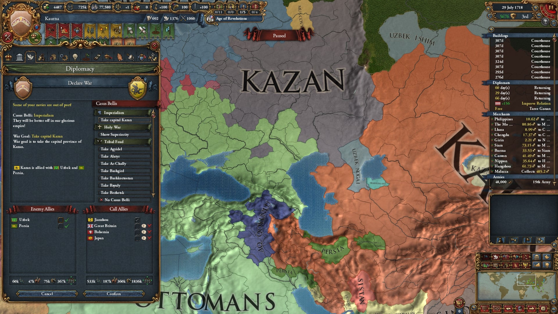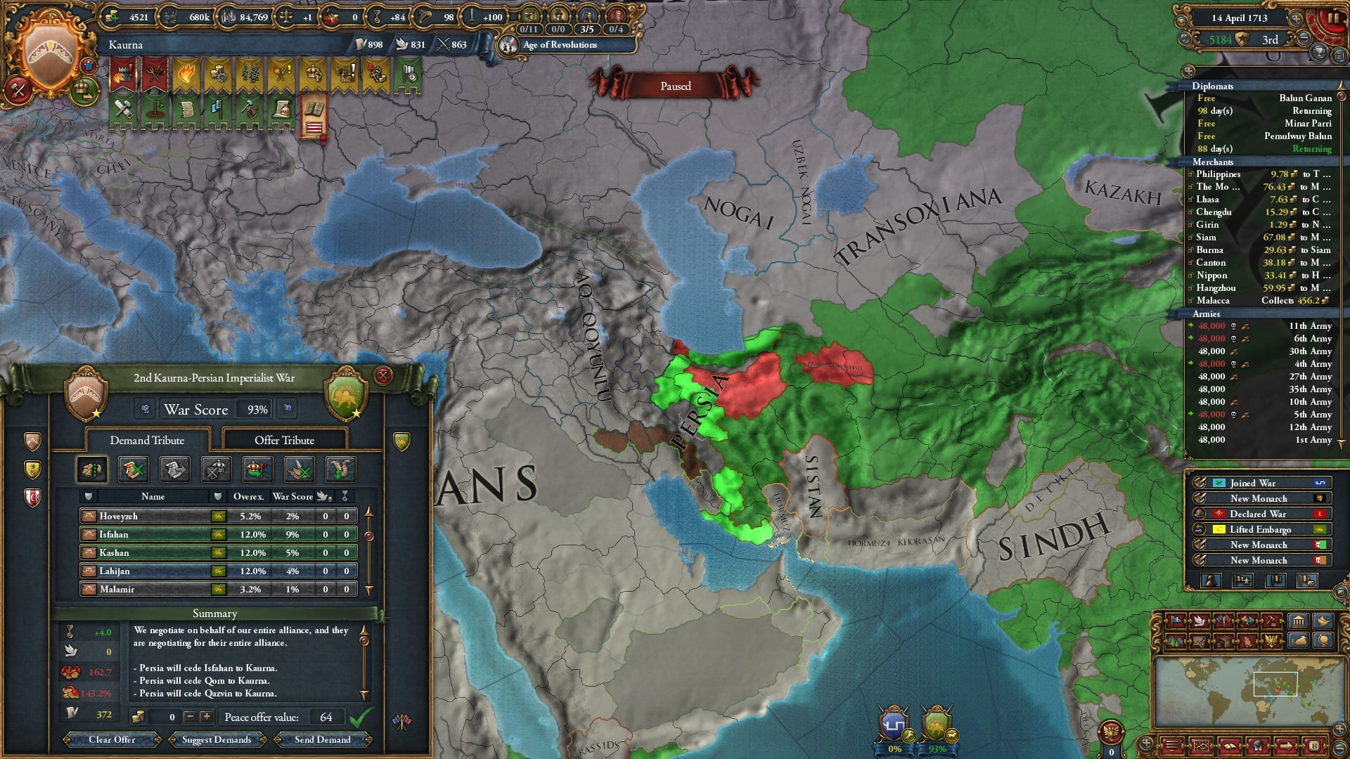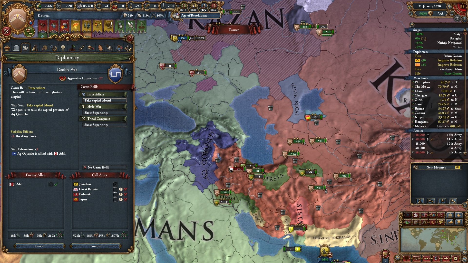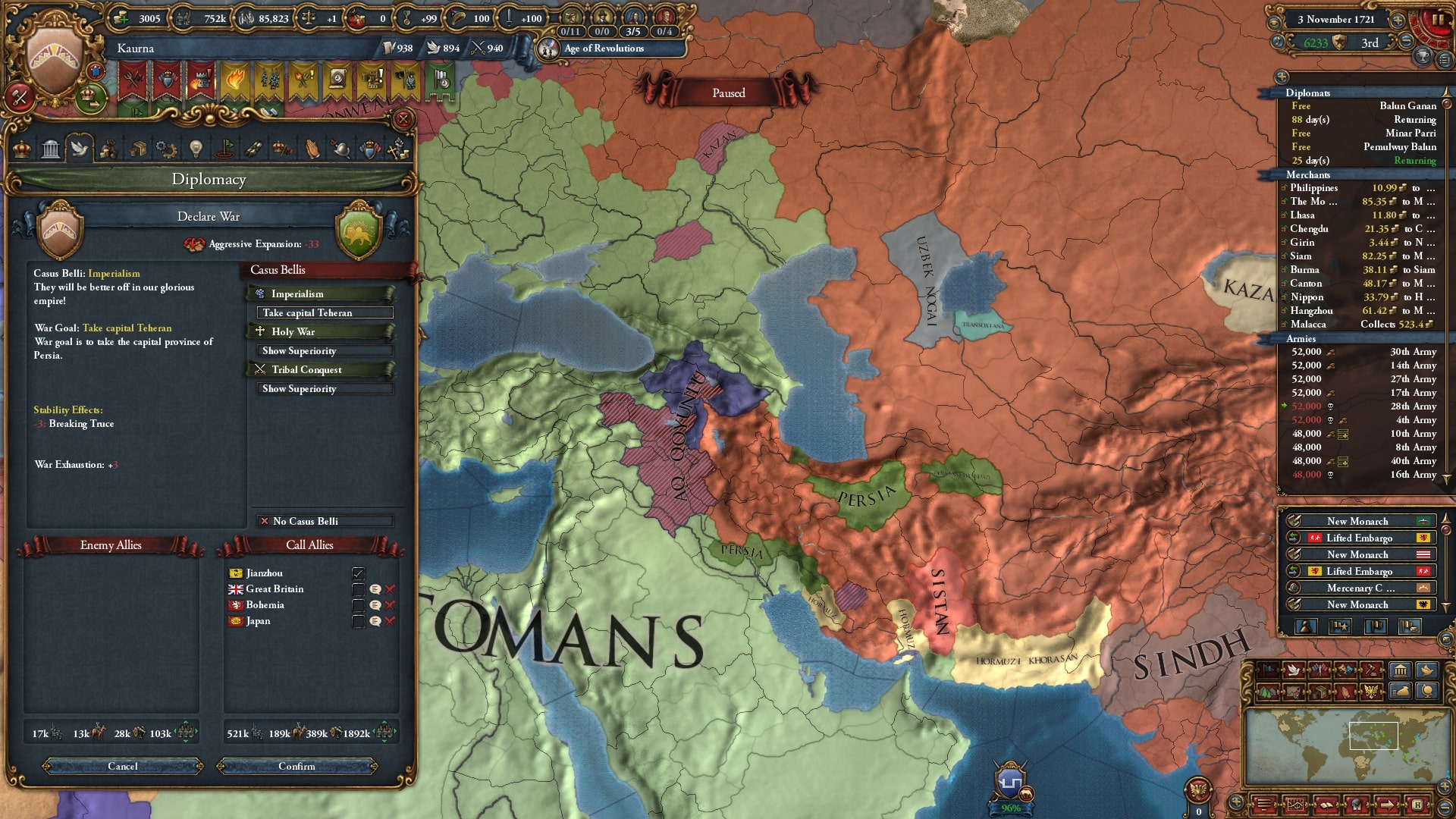 オスマンと白羊朝の同盟は1702年頃にオスマンが白羊朝の同盟国に攻めたことで外れていました。停戦期間が切れる前に白羊朝の併合までもっていきたいところ。