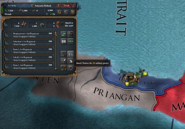 貯めておいた1200のDIP点を使って一気に3段階まで解放し、早速ジャワ島西部のプロビンスDemakへ植民を開始します。