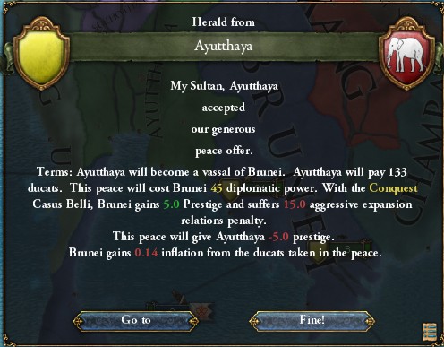 タイ地方はほぼBruneiの庭となりました。残るはLan NaにLan XangそしてPegu。これらの国がBruneiに降るのも遠い未来のことではないでしょう。たぶん。