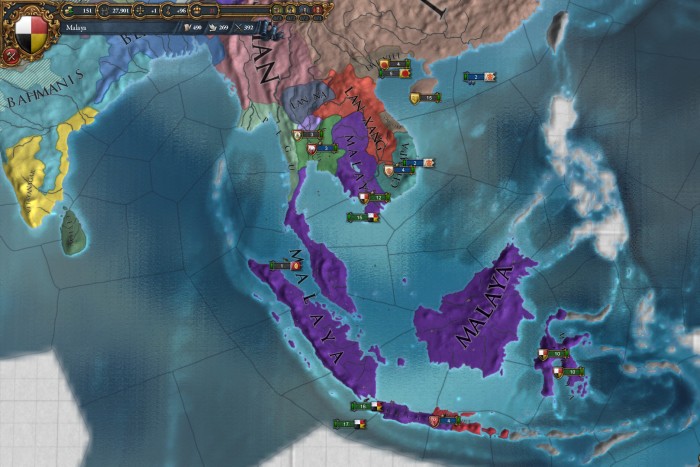 スコータイ王朝との同君連合、アンコール=クメール王朝の属国化など。マラッカが敵だったのは史実も変わらずのようです。