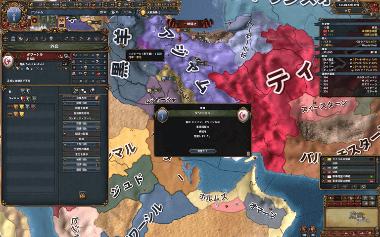 このダワーシルという国は軍事的には大して頼みにならない国ではござるが、前回述べた通り序盤は普通にスンナ派国家としてプレイするので、この国と同盟(かつopinionが150以上等若干の付加条件あり)していると統治点を消費して行える、ハンバル派の学者の招聘は必須コマンドですなww