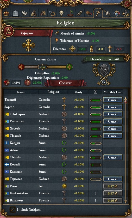 属国には毎月補助金40ダカット程渡しているので積極的に改宗してくれています。