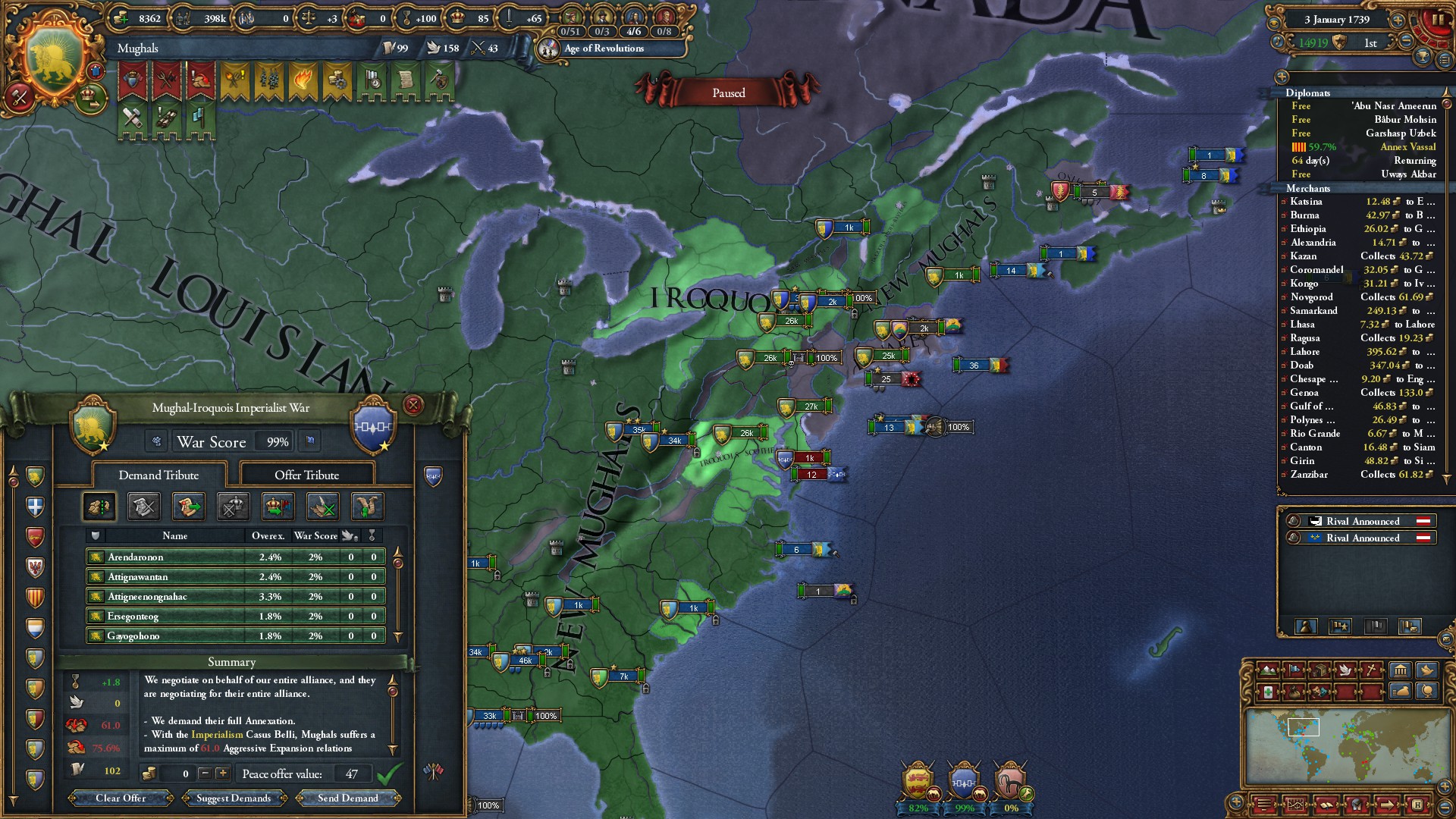 イロコイ完全併合。今まで触れていませんが、アメリカとアフリカの現地国家はこの段階で消滅しました。