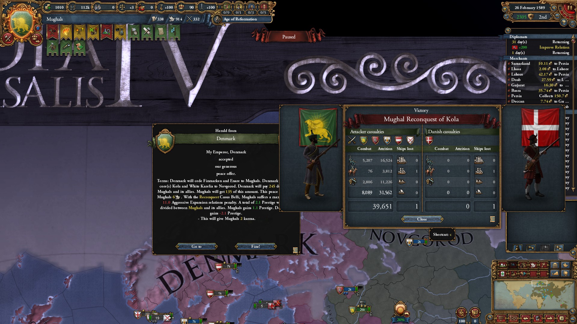 欲しい4州をいただいてさっさとデンマーク戦終結。向こうの陸上兵力の損失は迫真の0。