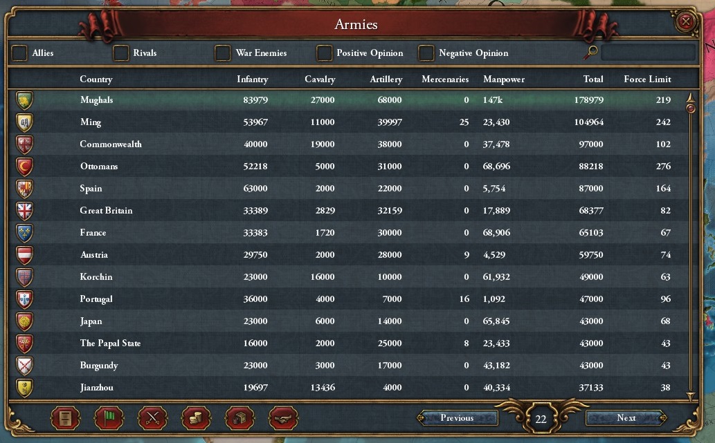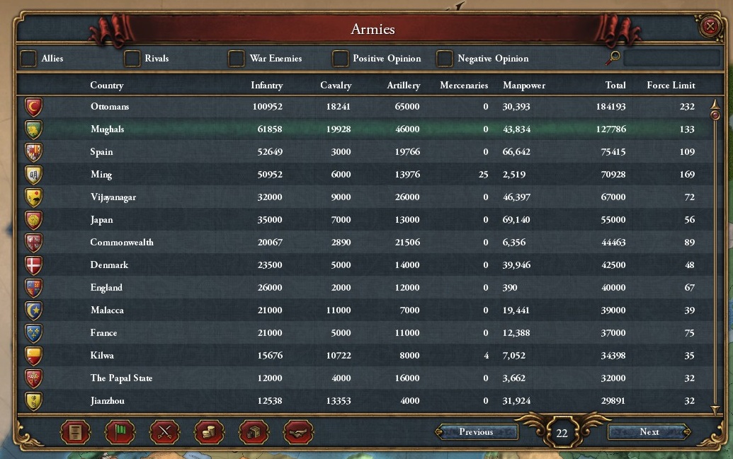 1557年の各国兵力数比較。オスマンは軍量アイデアを取っているので最大保有兵力が232Kです。