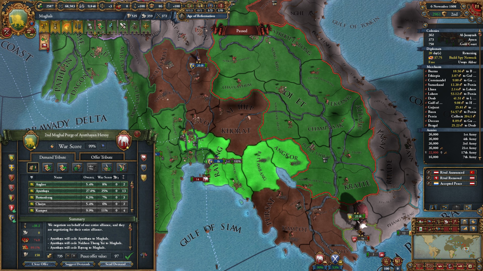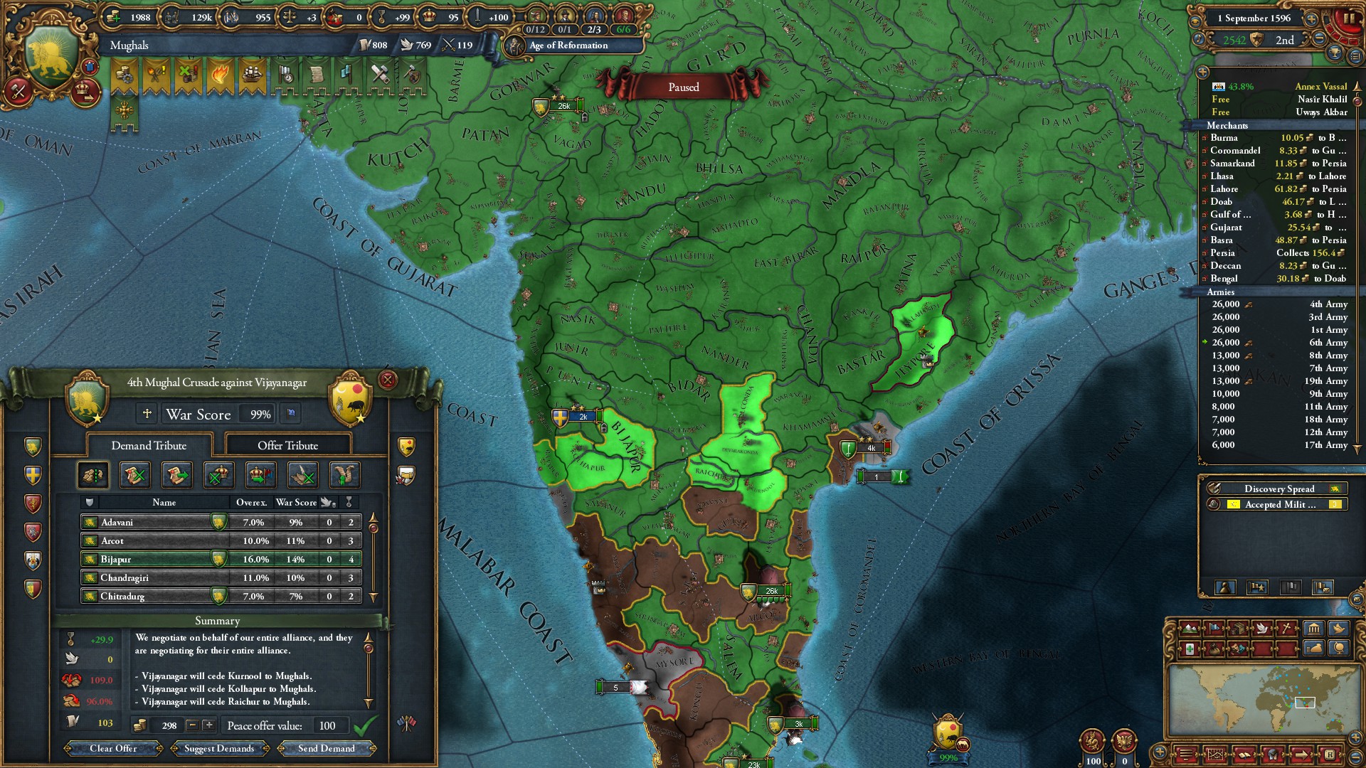 ヴィジャヤナガル戦終結。グジャラート文化を同化したことで陸軍損耗減少のボーナスを獲得しました。