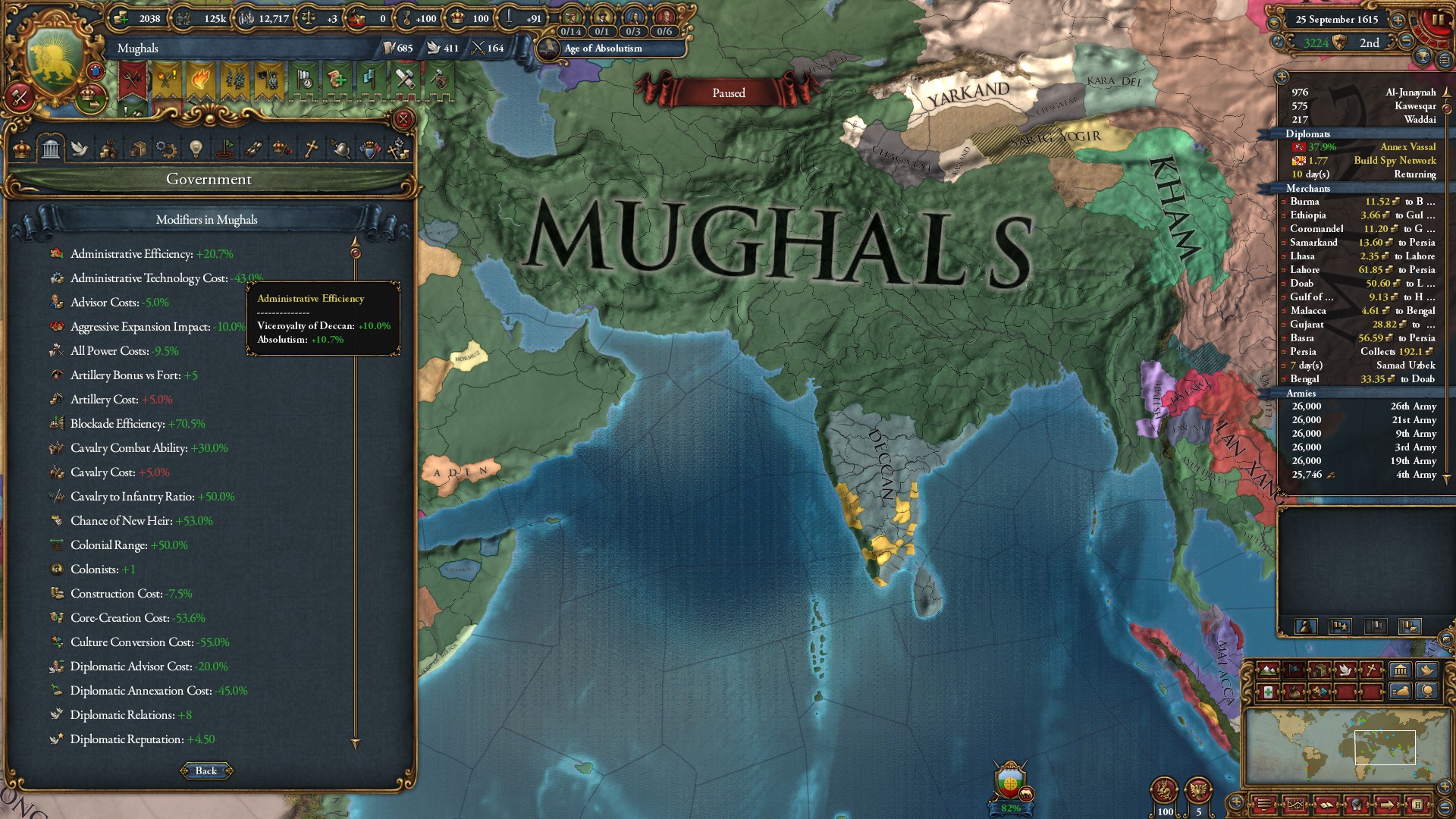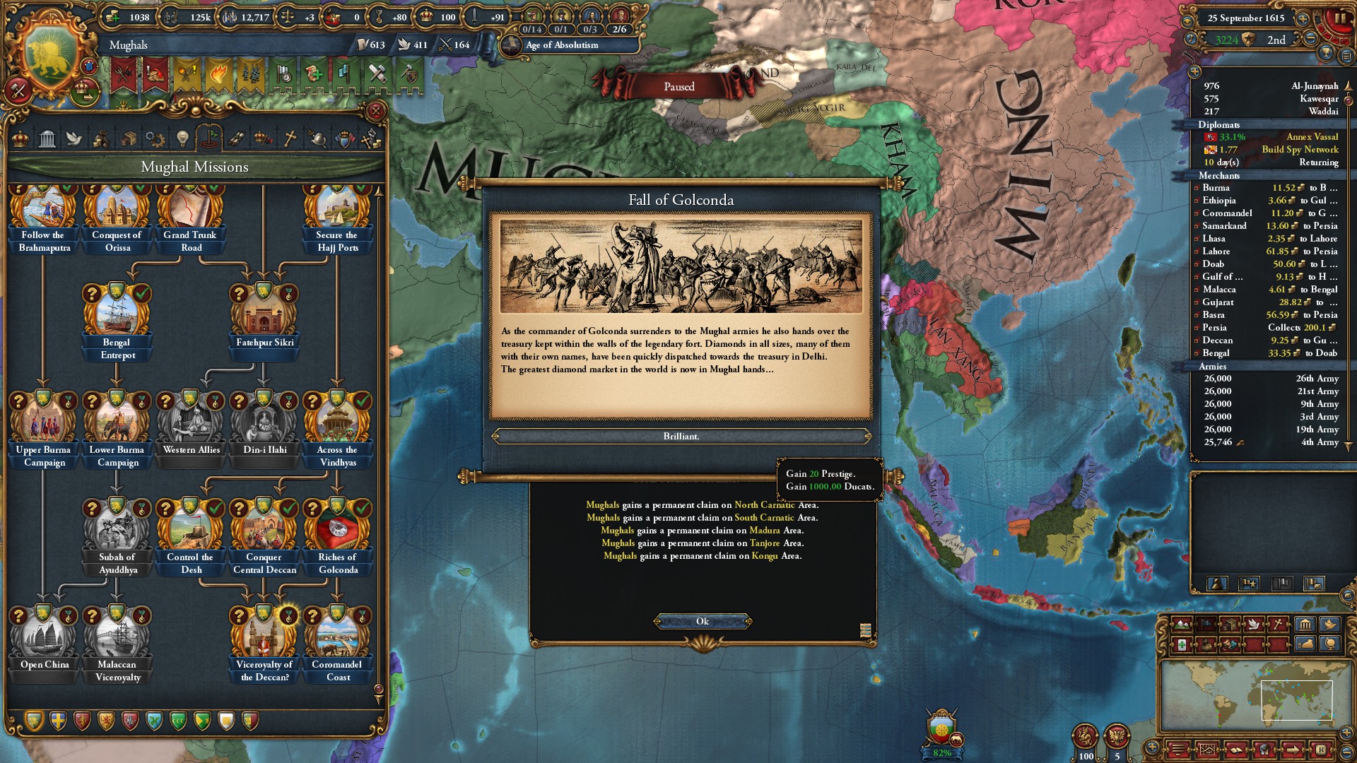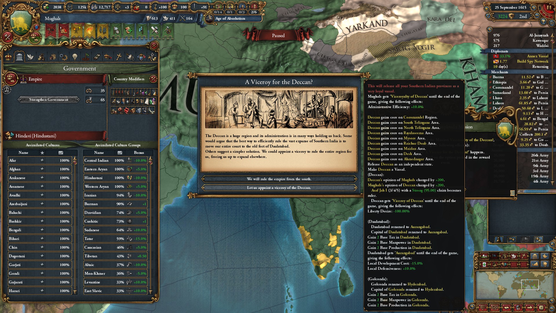 ミッション「デカンの副王」を達成したことで、デカンの建国の代わりに統治効率+10%のイベントが発生。
