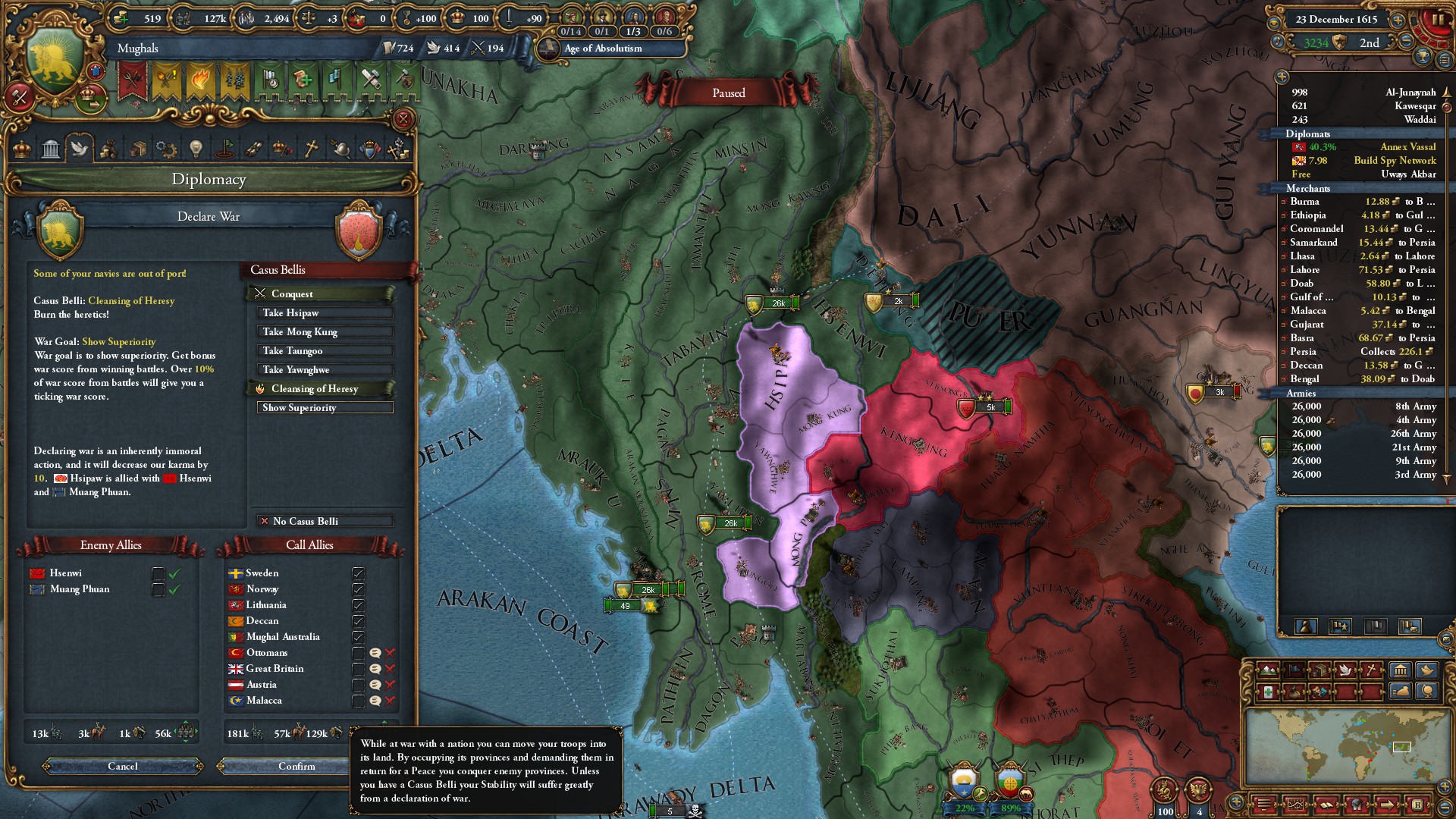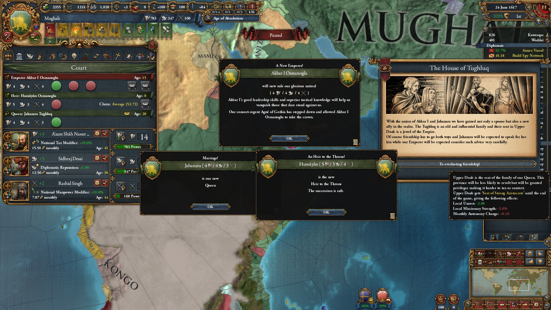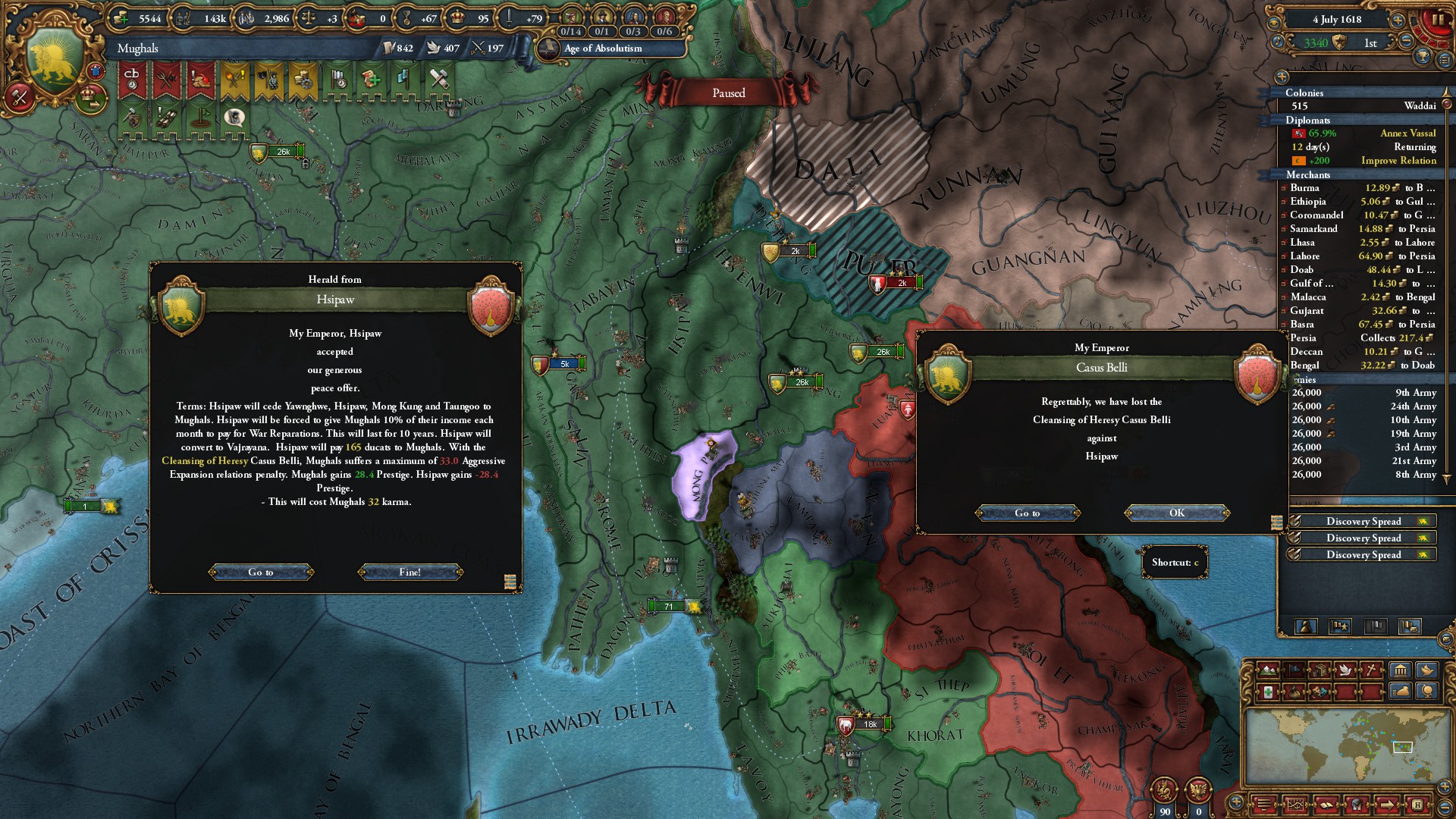 ミッション「デカンの副王」を達成したことで、デカンの建国の代わりに統治効率+10%のイベントが発生。