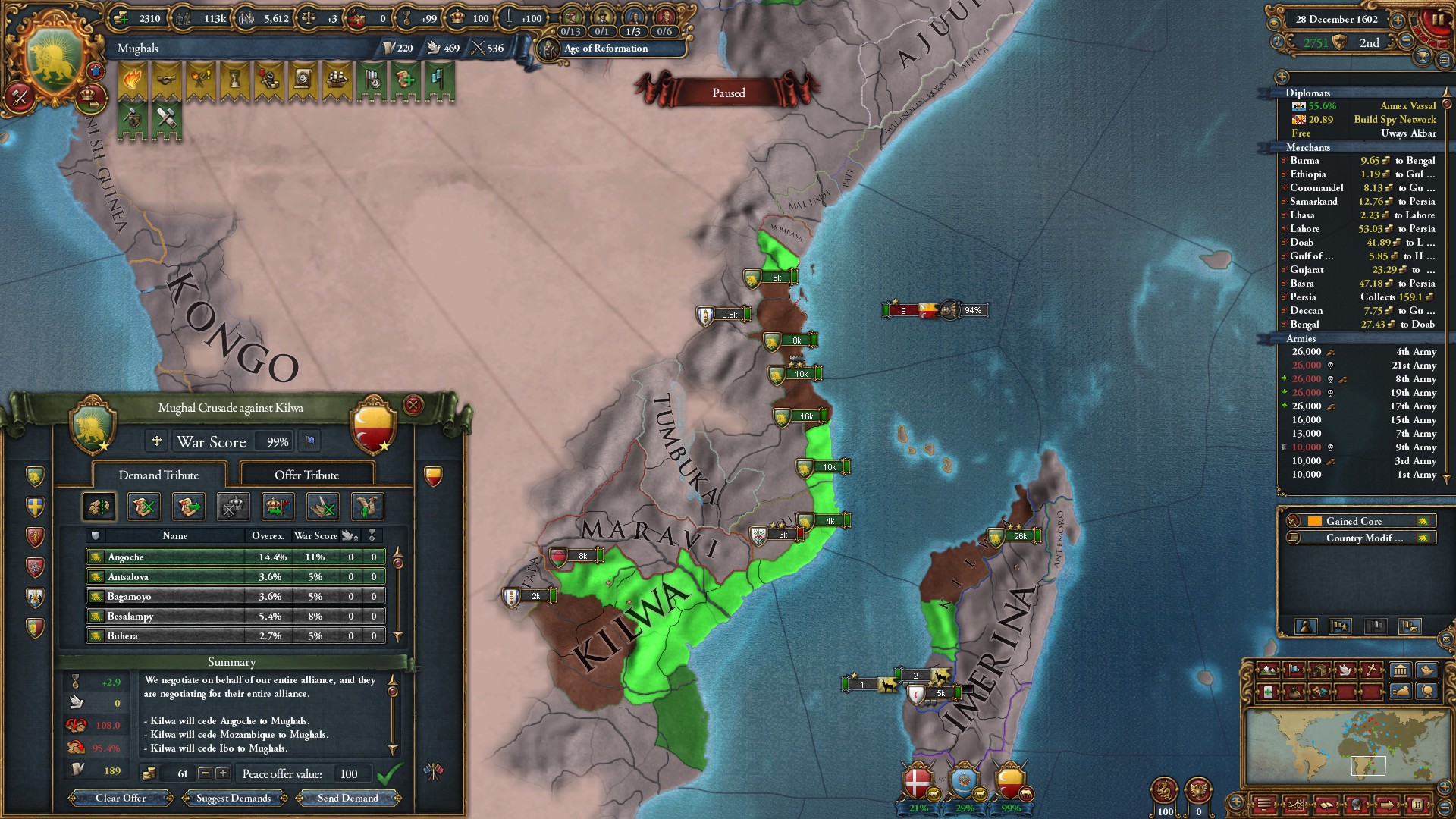 キルワ戦終結。象牙が採れる地域とCotを中心に割譲させました。