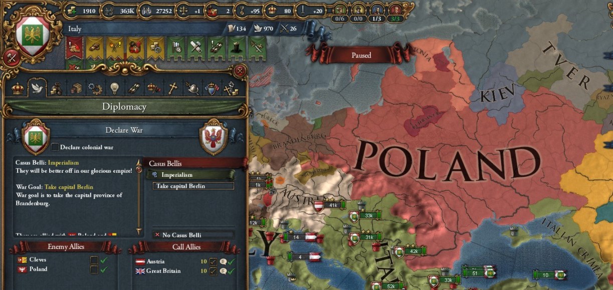 イギリス・オーストリアはこちらに立って参戦してくれるので、ポーランドの外交網はズタズタです。やっはは~