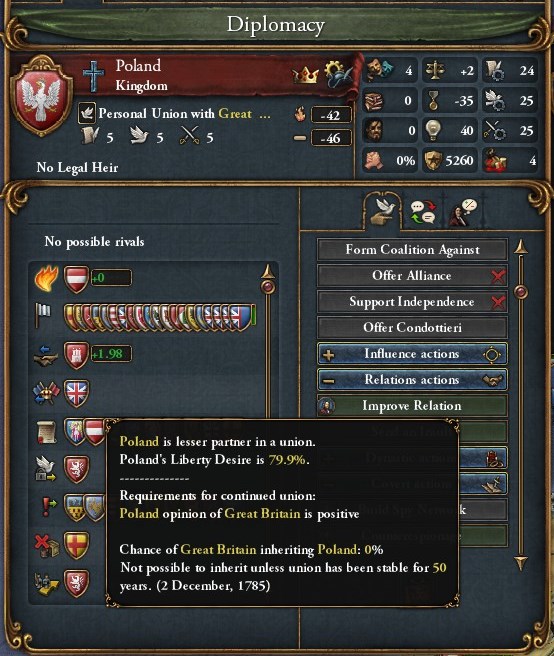 2)ポーランドが凋落した結果、威信がマイナスに転落。この状態でポーランド王が死んだ結果、イギリスの同君連合下位国に。