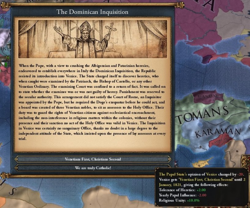 1463年にはヴェネツィアのイベント「The Dominican Inquisition」が発生。Venetians First,Christians Secondを選んで宗教統一性をアップさせます。