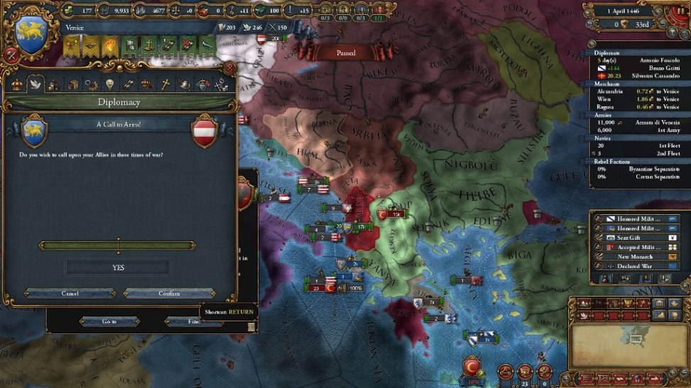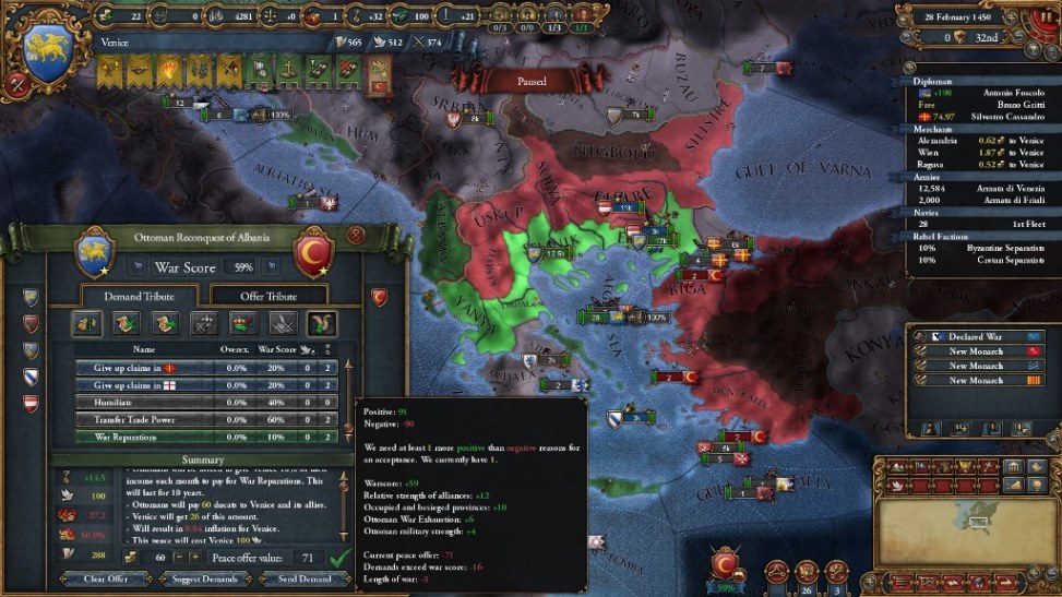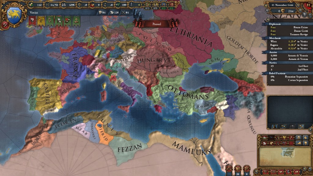 HREには所属していないため、1490年まではイタリア北部諸州には手を伸ばしづらい状況にありますし、ナポリはアラゴンと同君連合を構成していてなかなか手が出せません。教皇庁に最初から喧嘩を売るのもデメリットが多いため、イタリア方面は序盤のターゲットから外します。ハンガリーはオーストリアと同盟を結ぶことが多く、こちらも手が出せません。そのため最初の狙いはバルカン半島の小国に定めますが、ただ東方にはヴェネツィアの歴史的な敵、オスマン帝国が鎮座していてすぐにぶつかることとなります。