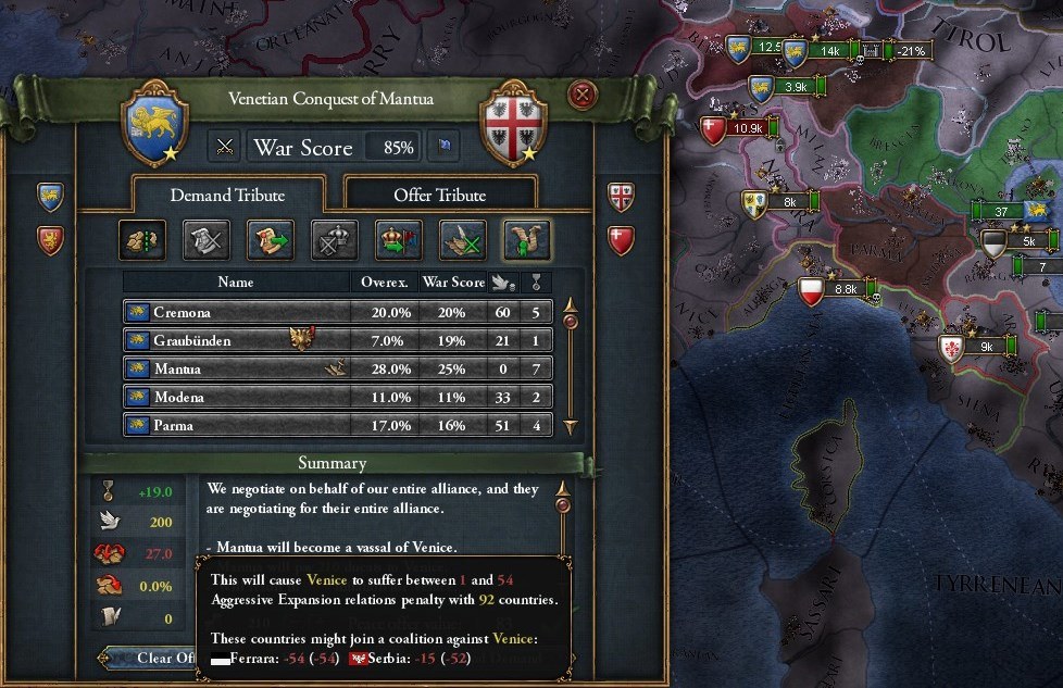 最初のターゲットはMantua。当初はTradeLeagueに加盟していた仲間ですが、いつの間にかに勢力を拡大してLeagueを離脱していました。