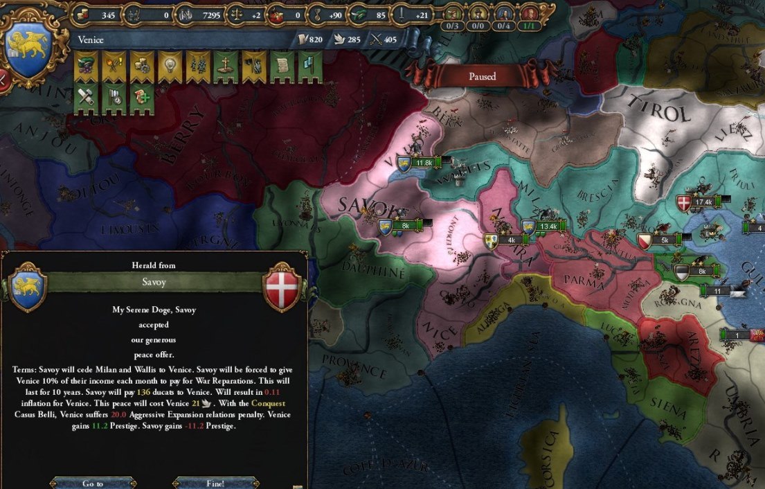 その間に傭兵も含めて立て直した戦力でSavoy領を占拠。なんとかMilanの割譲は果たすことができました。