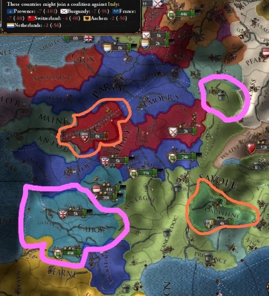 上の画像は直前の対仏・プロヴァンス戦の結果。フランス地方の主要3か国に大きなAEが乗っています。