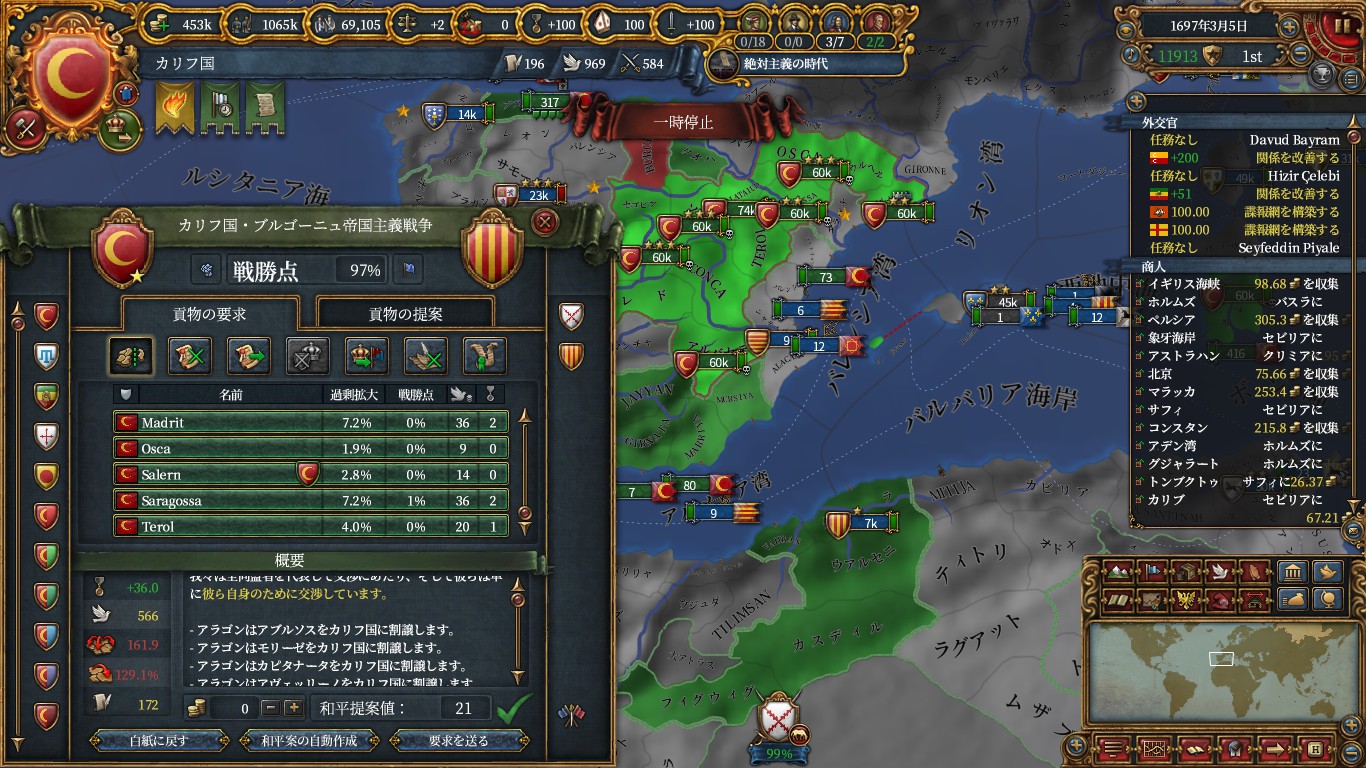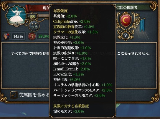 オスマンの場合、外交評判上昇による属国化のしやすさ上昇、州戦勝点コスト減-20%、コンプリートボーナスの外交行動による安定度低下の緩和で属国化のための婚姻を行いやすくなることが良いですね。