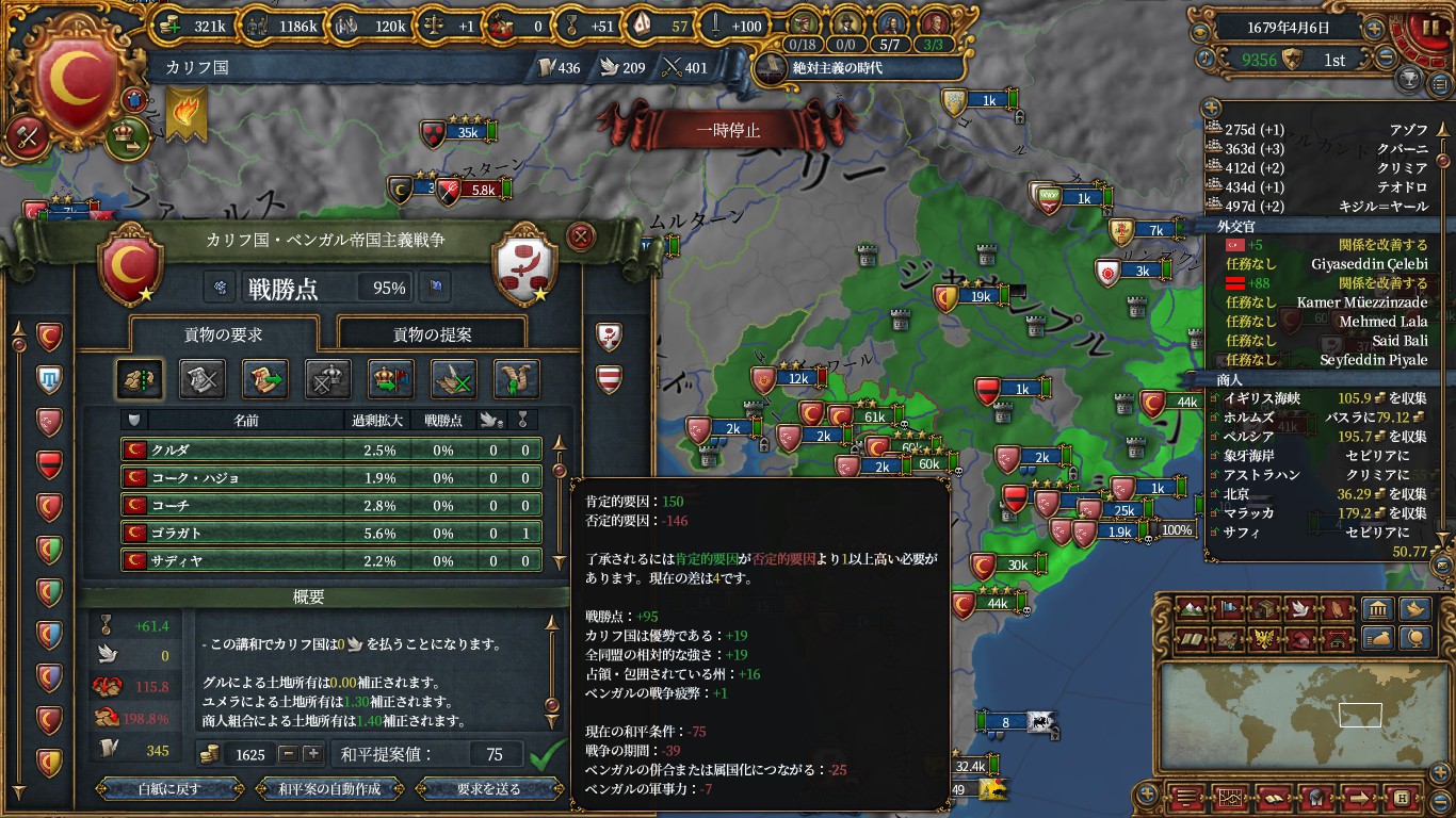 1676年、統治外交技術23に到達し帝国主義CBと統治効率+10%をゲット。