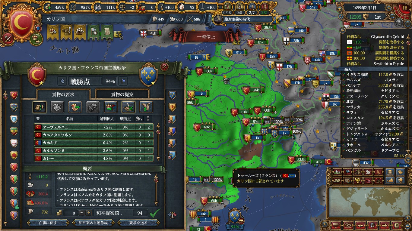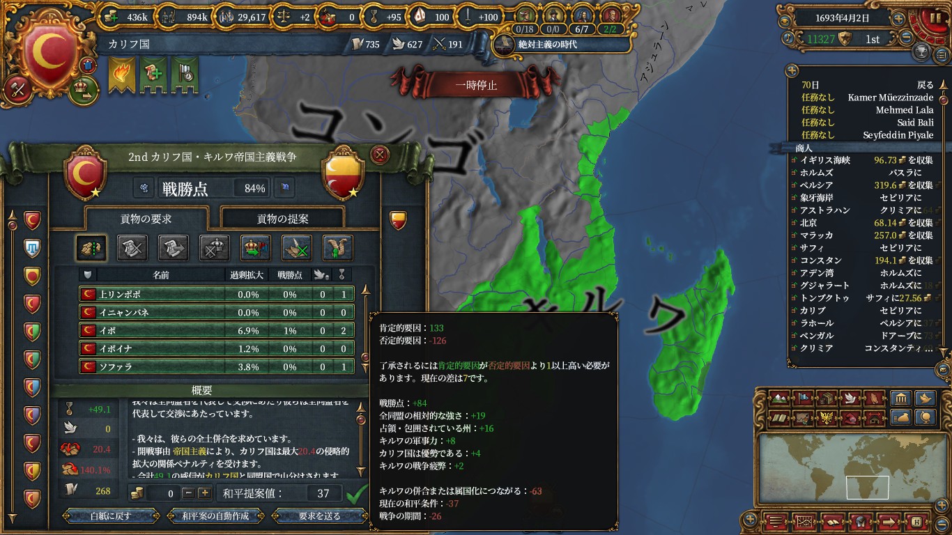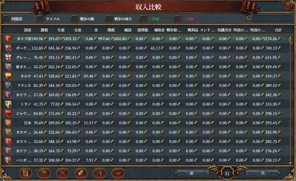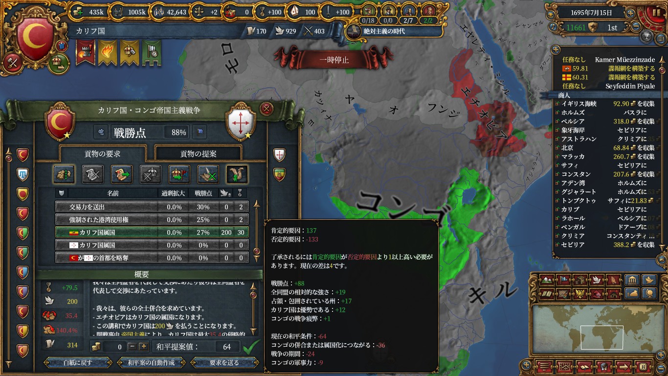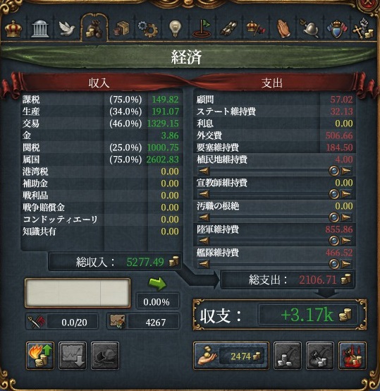 内政面でもエヤレト乱立プレイでは属国からの扶養限界+100%と属国収入+25%はかなり寄与してくれます。