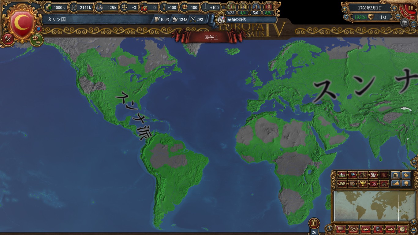 神権の戦勝点コスト減のおかげで余裕の全土併合です。