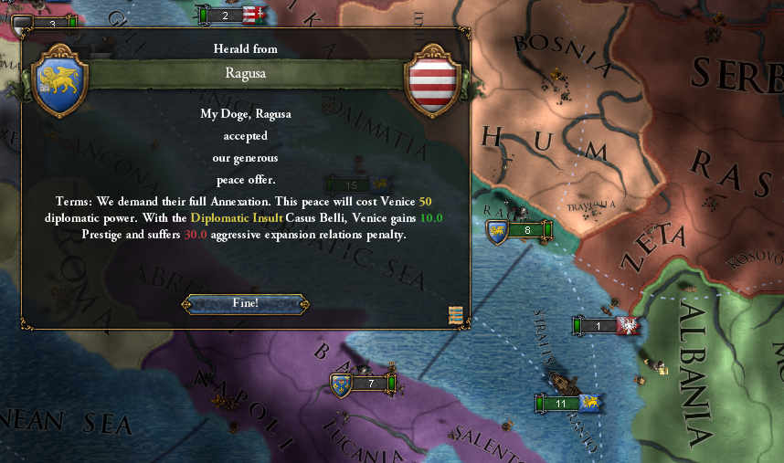 フランチェスコは、まず、フェラーラやマントバと同盟を結び、後背を固める。(ミッション)そして、既に属国になって久しいナクソス公国併合の為に大使を送る。また、オーストリアとハンガリーに対しても友好関係を築く事を努めた。(リロードができないのでチキンプレイです^^)