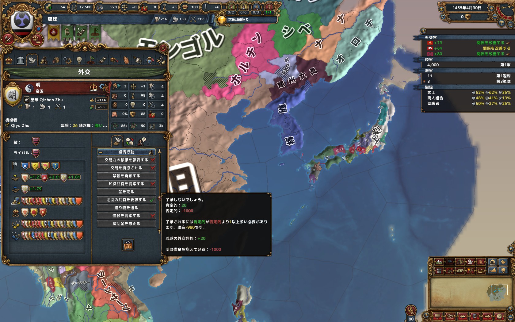 3.4.2の女王摂政なので平均的能力なわけですが、これでも琉球にとっては名君主*1として讃えられることになるでしょう