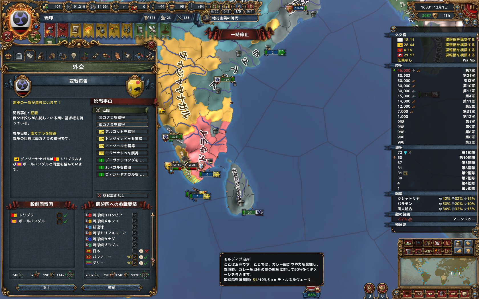 インドでの戦争。自分はもちろん属国にも請求権をつけさせて領土を分け合う感じで戦争してます。帝国主義CBまではこんな感じ。
