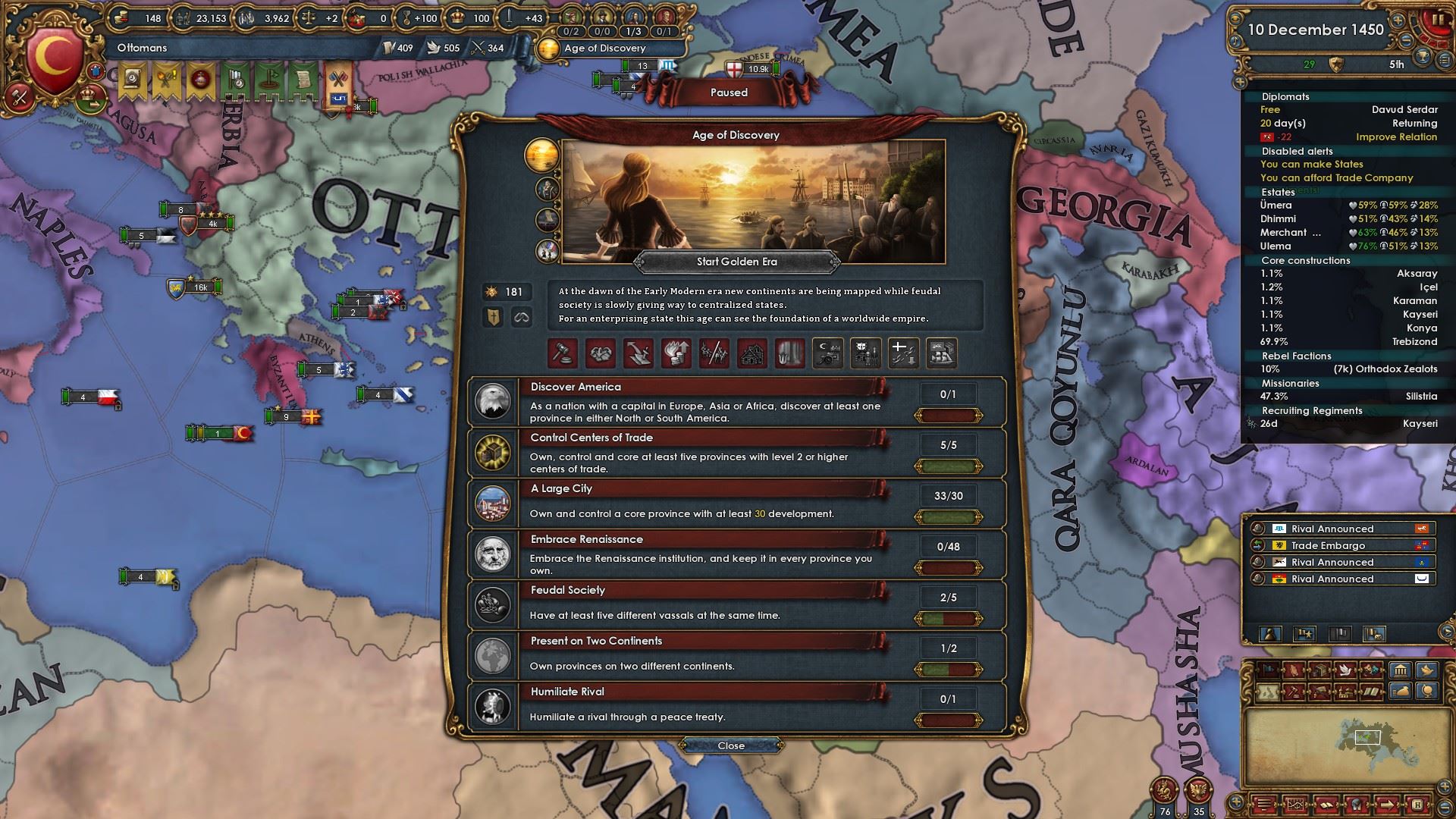 首都コンスタンティノープルの開発度及び貿易中心地のレベルを上げることにより目標を2つ達成しています。