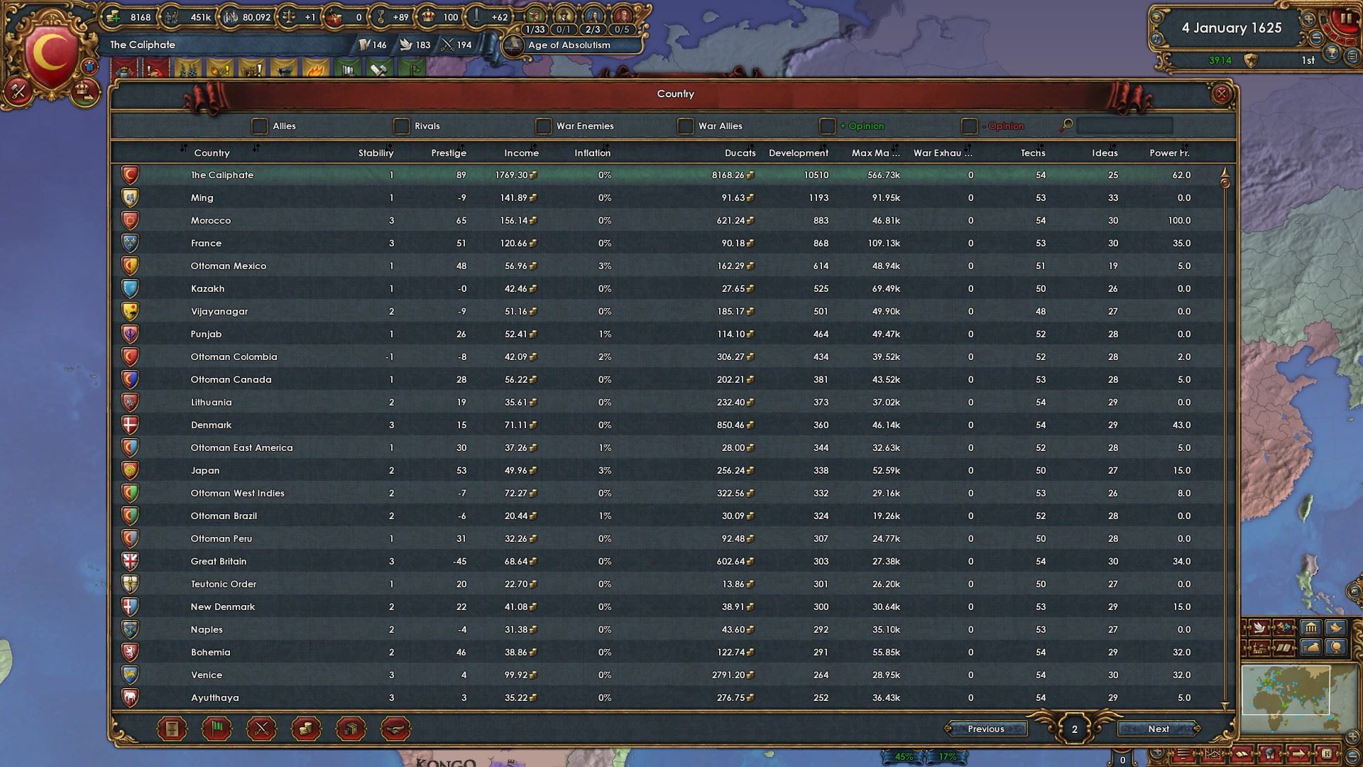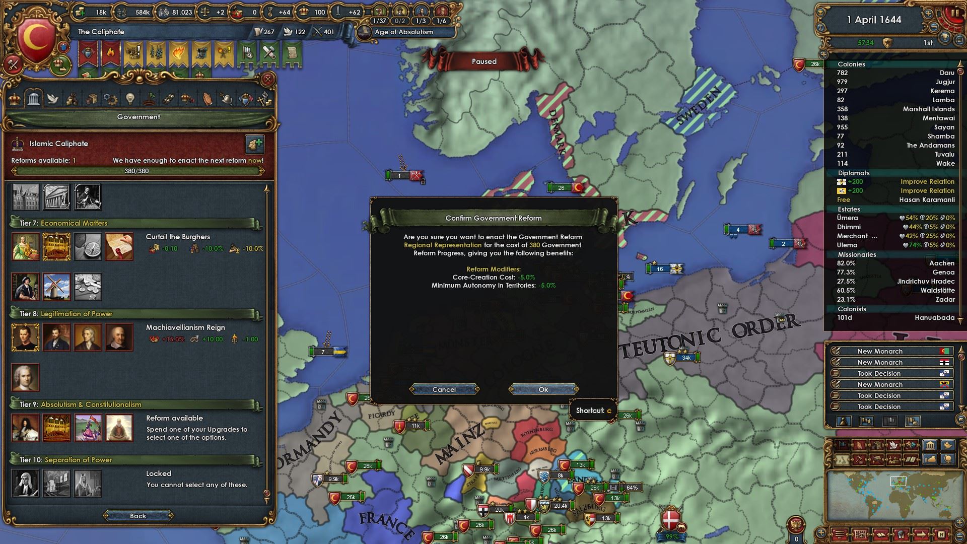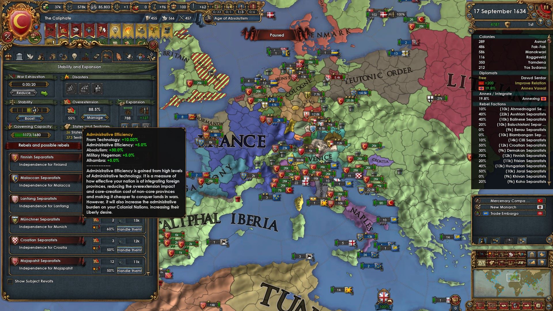 絶対主義値もMAXになったのと諸々の補正により統治効率が55%になりました。