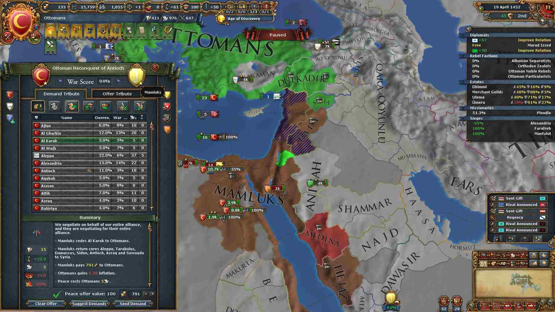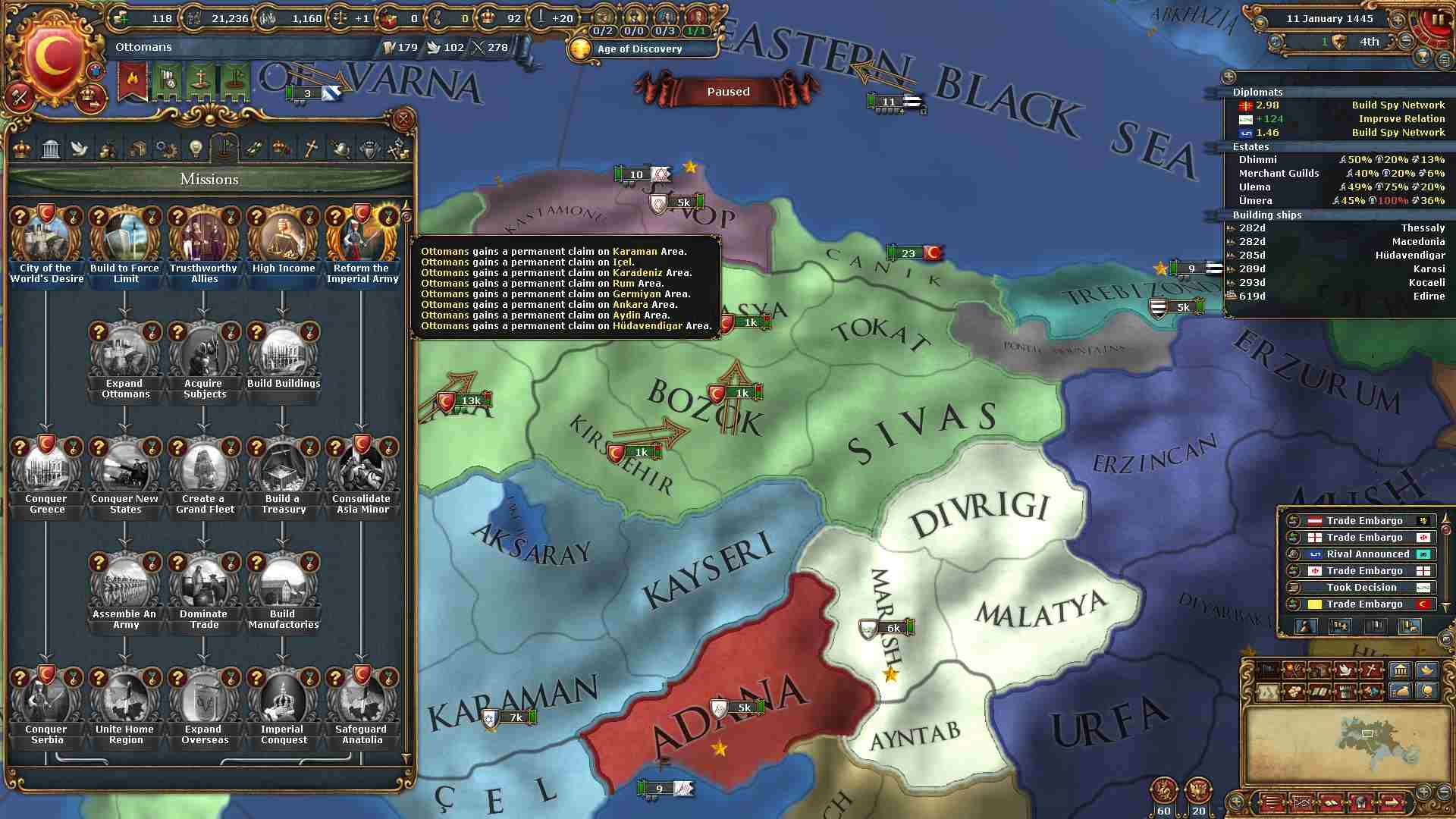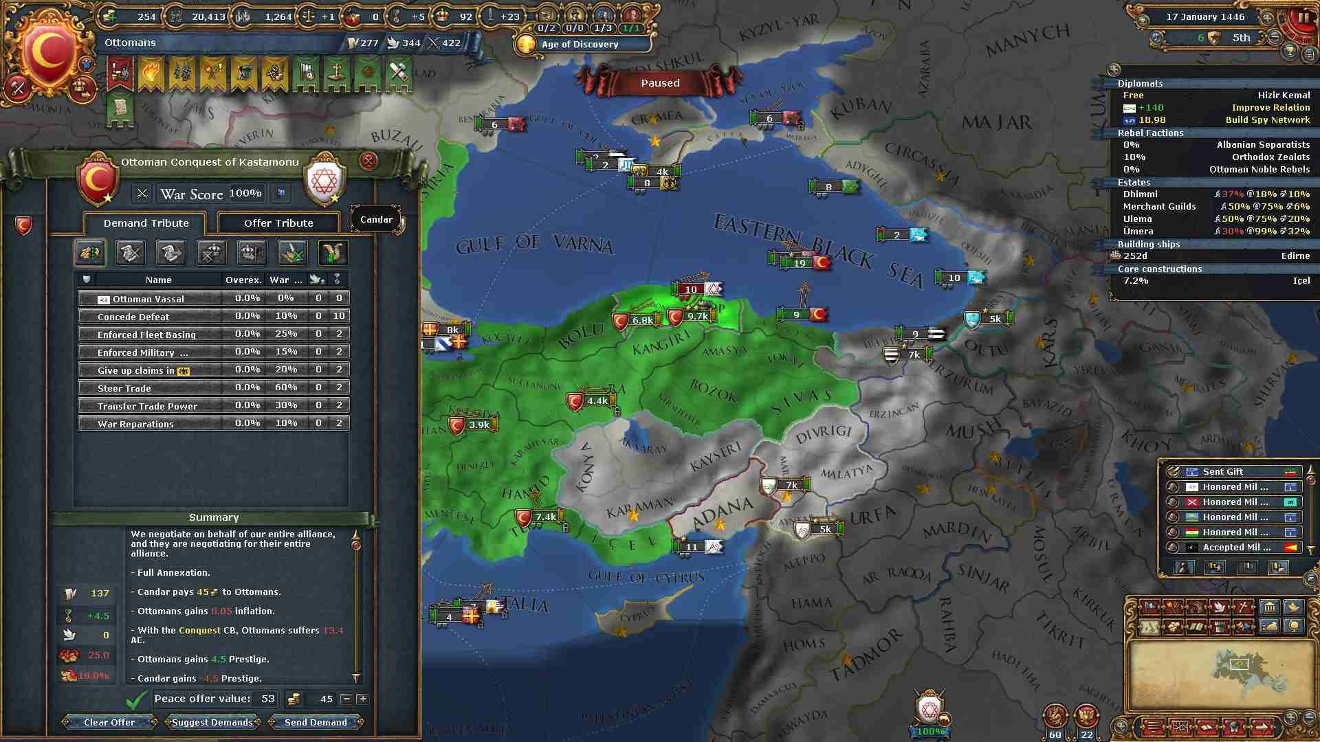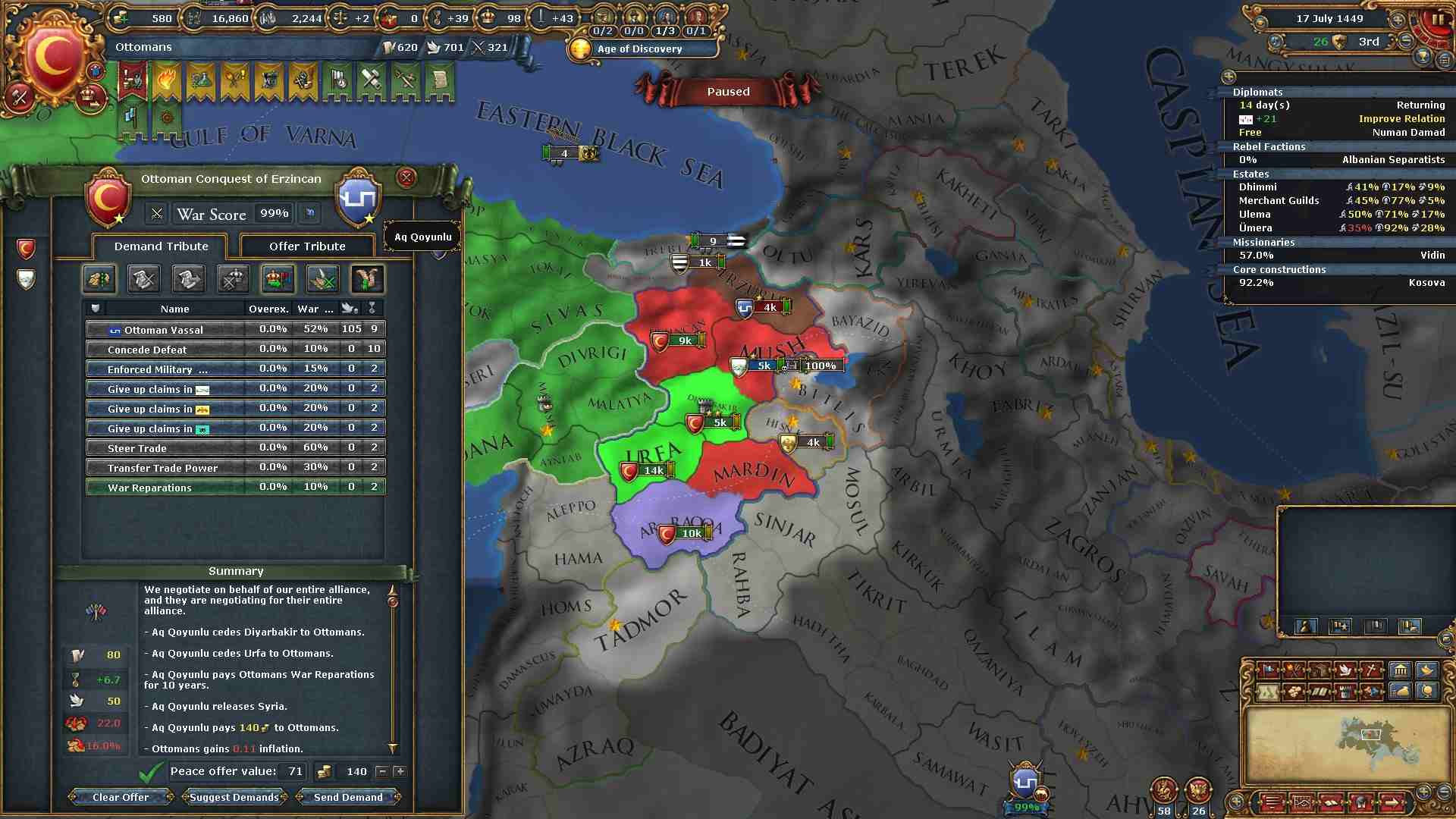 前回のAARでも書きましたが、デュルカディルの領土は永久請求権が得られる地域ですので直接征服したくなりますが、AEマネジメントの点で外交併合を選択しています。