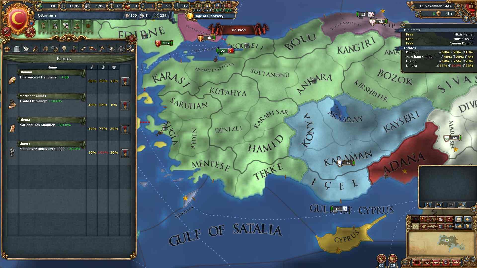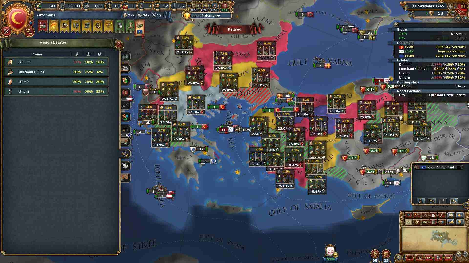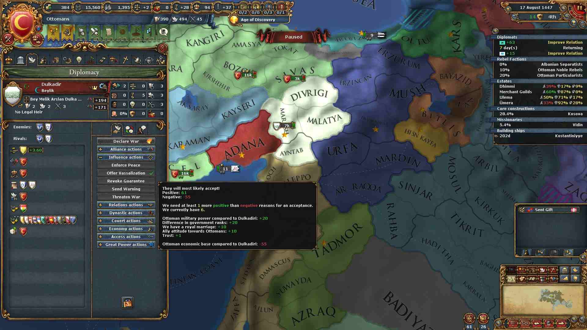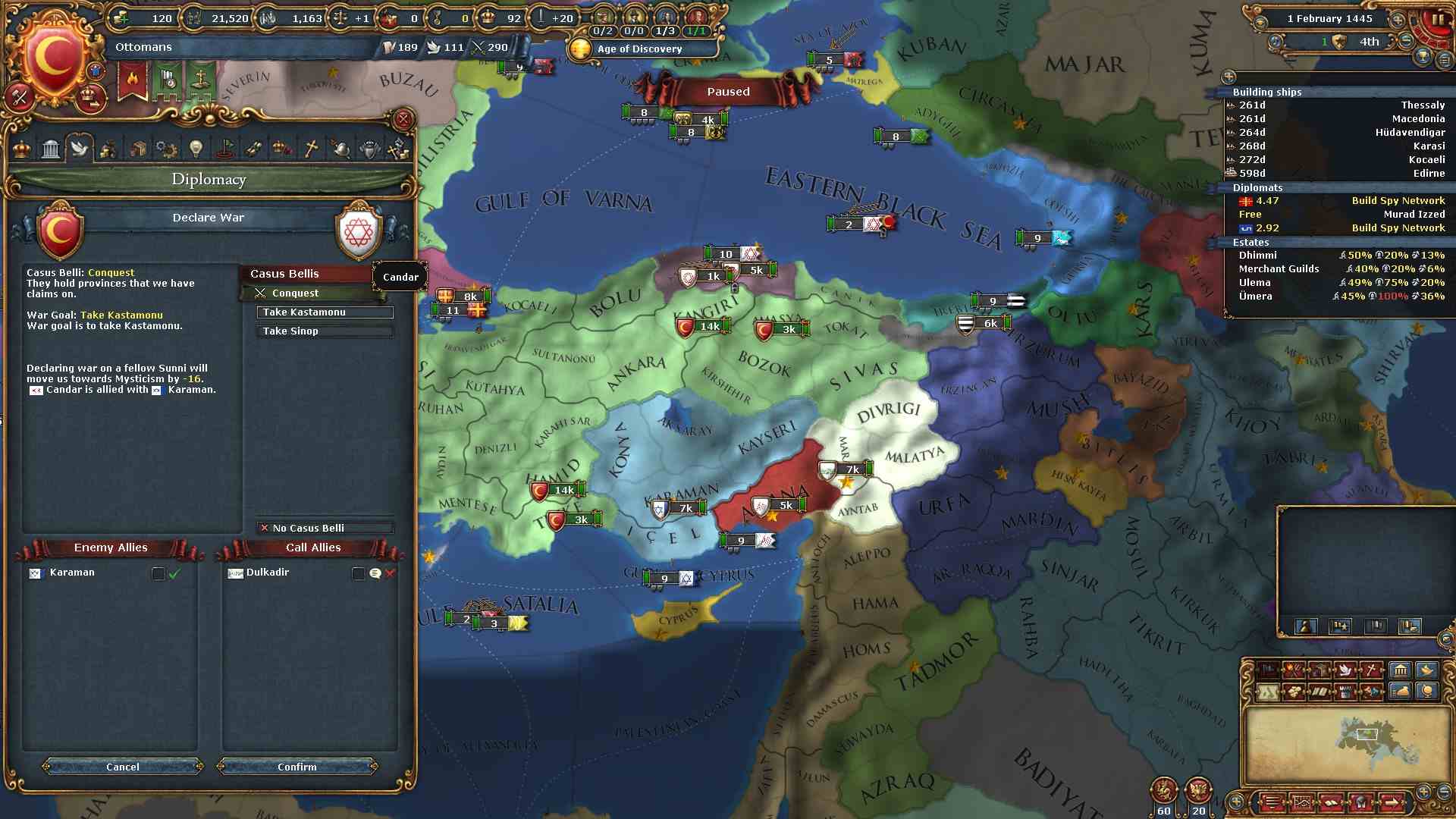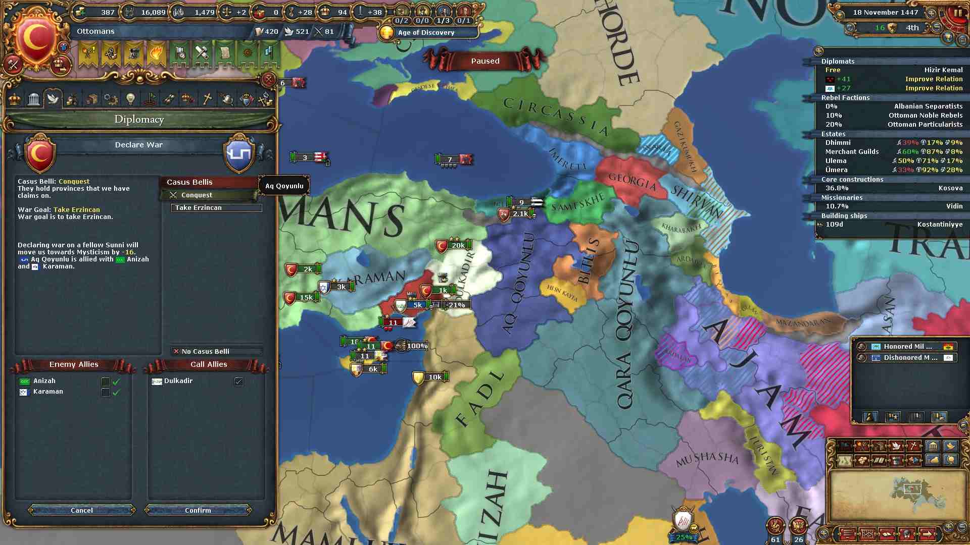 前回のAARでも書きましたが、デュルカディルの領土は永久請求権が得られる地域ですので直接征服したくなりますが、AEマネジメントの点で外交併合を選択しています。