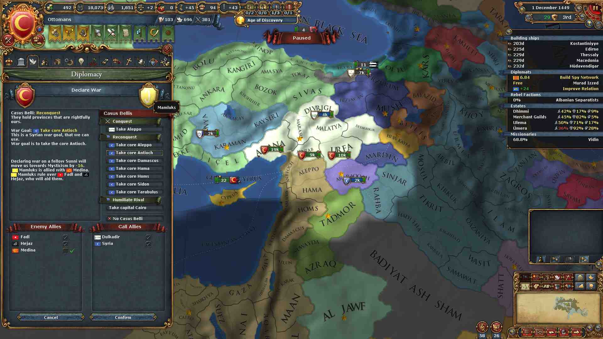 傭兵をさらに雇い戦力を増強させた上でシリアのReConquest CBを使ってマムルークに宣戦布告します。