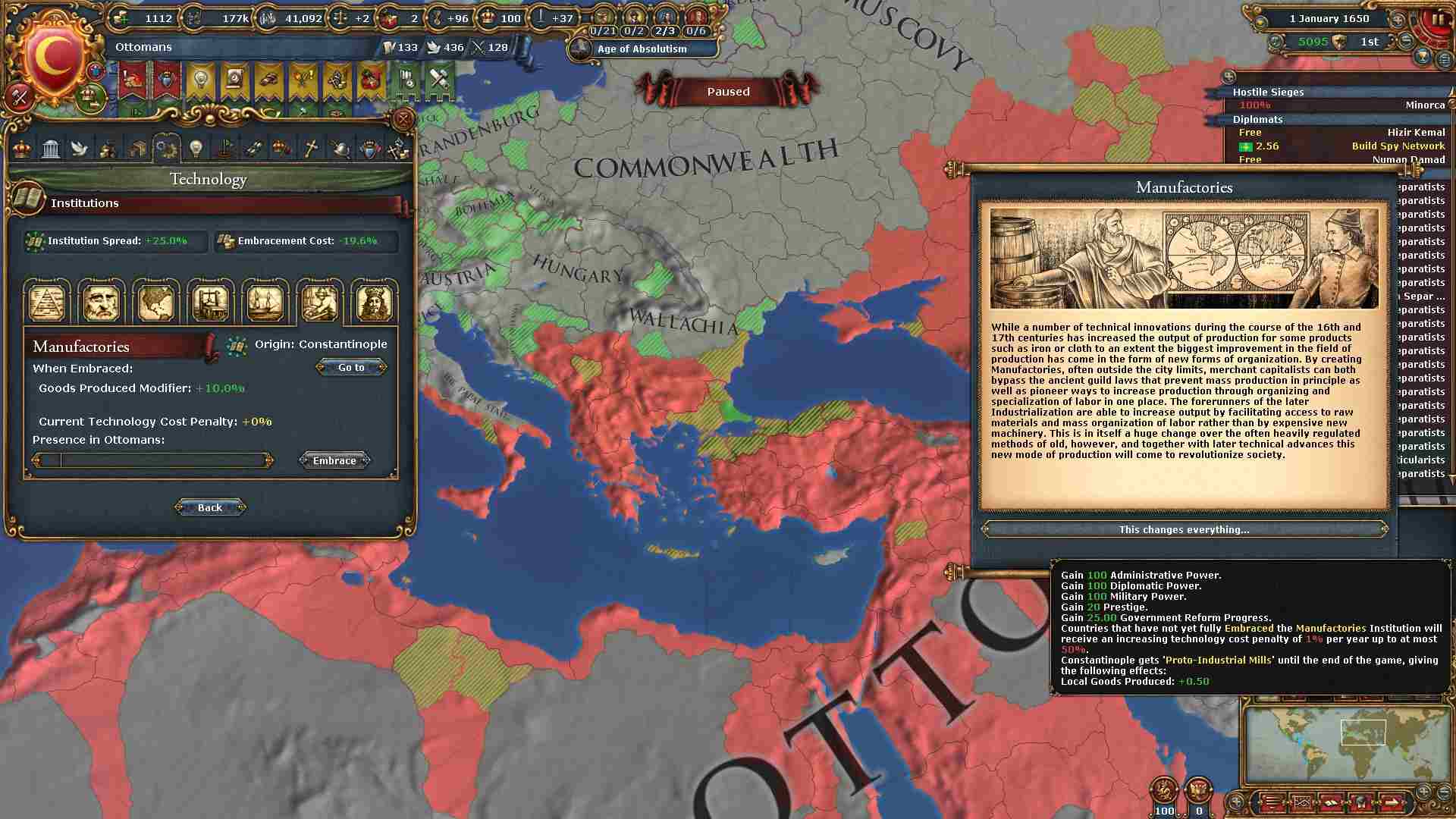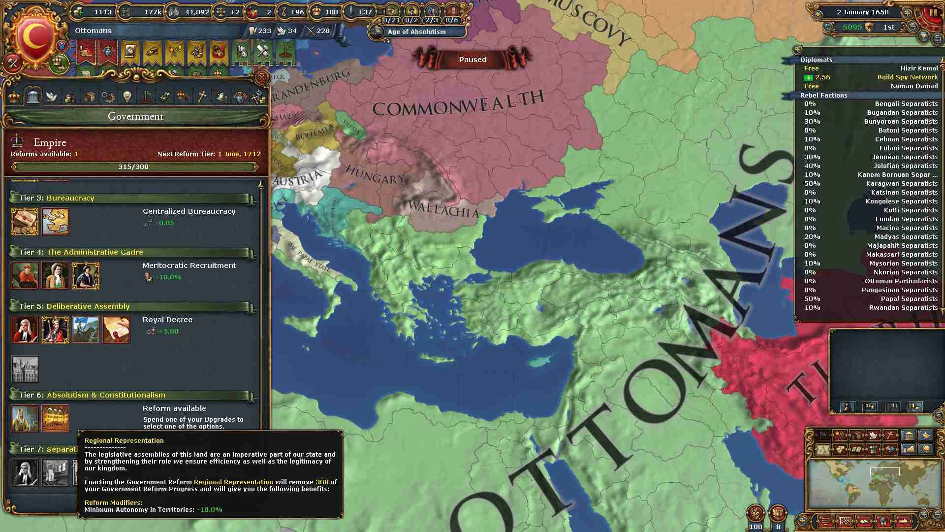 Regional Representation(地域の代表)を選択したことで、全てのテリトリーの自治率が-10%されます。世界征服プレイでは非常に効果があります。