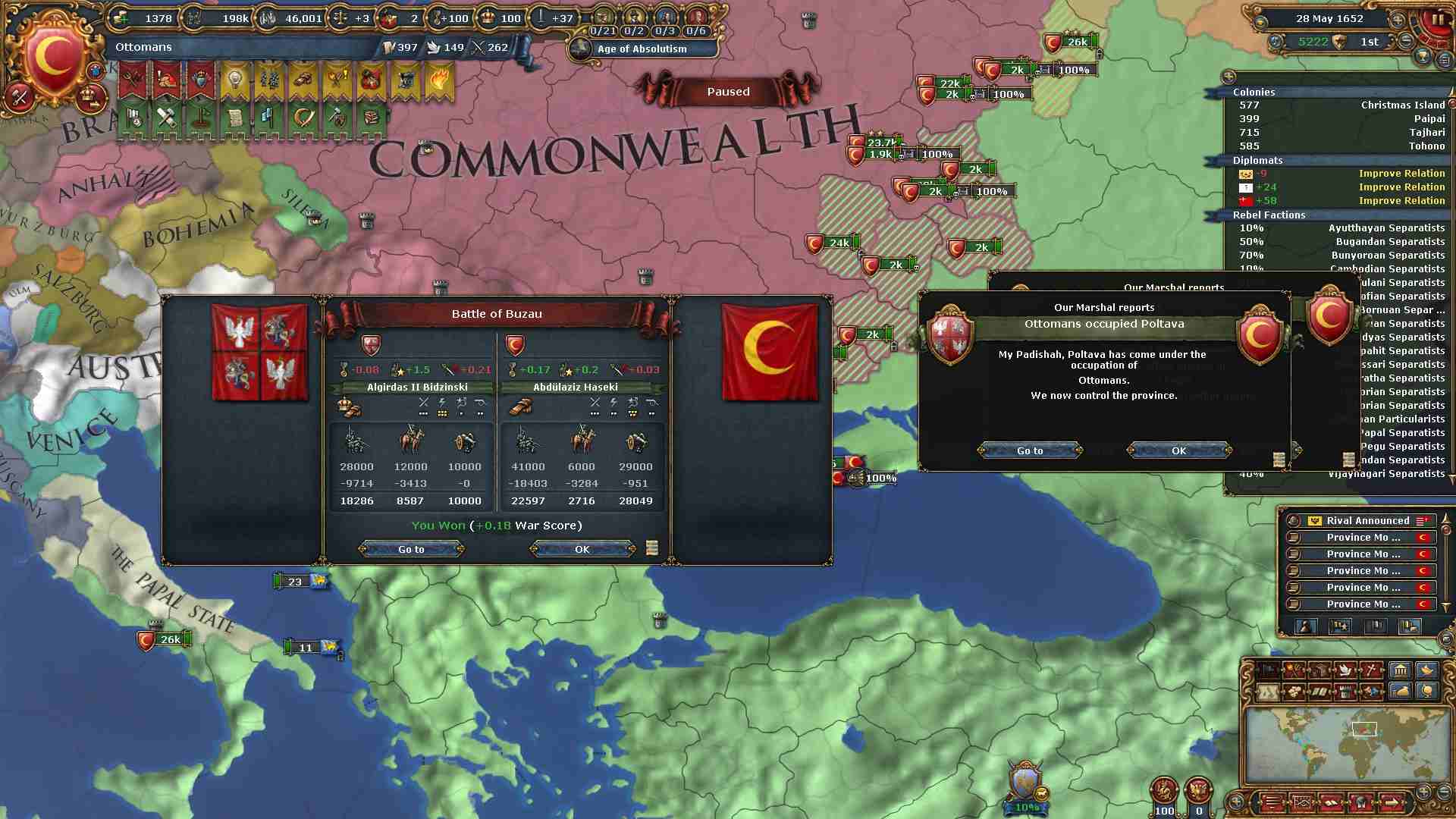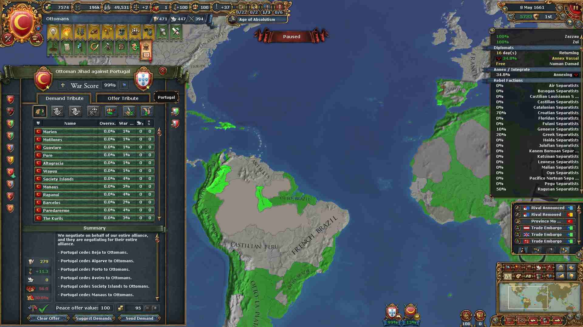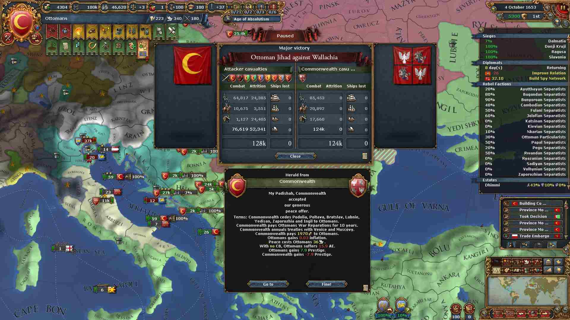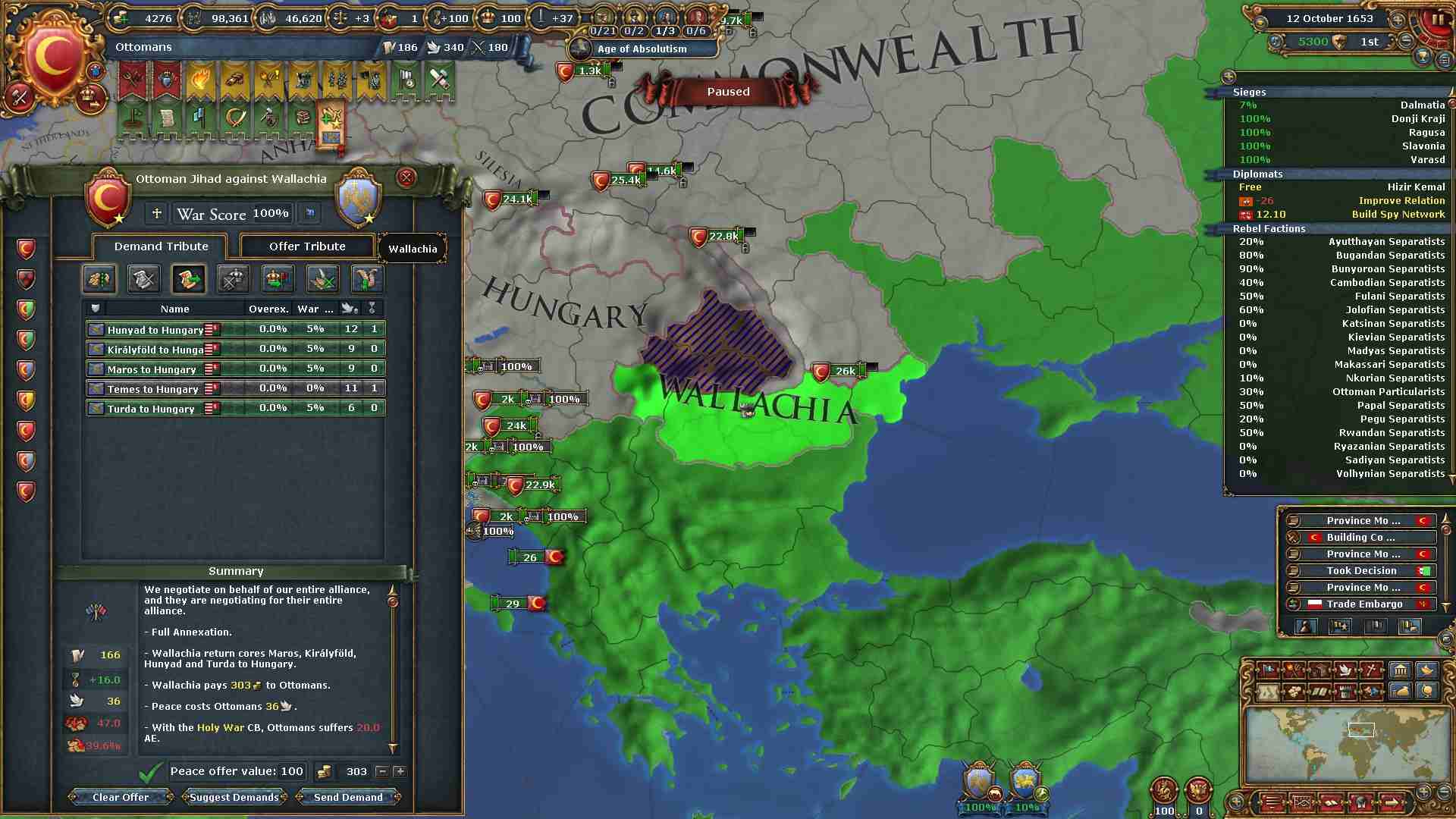 戦勝点一杯に領土及び賠償金を得ています。