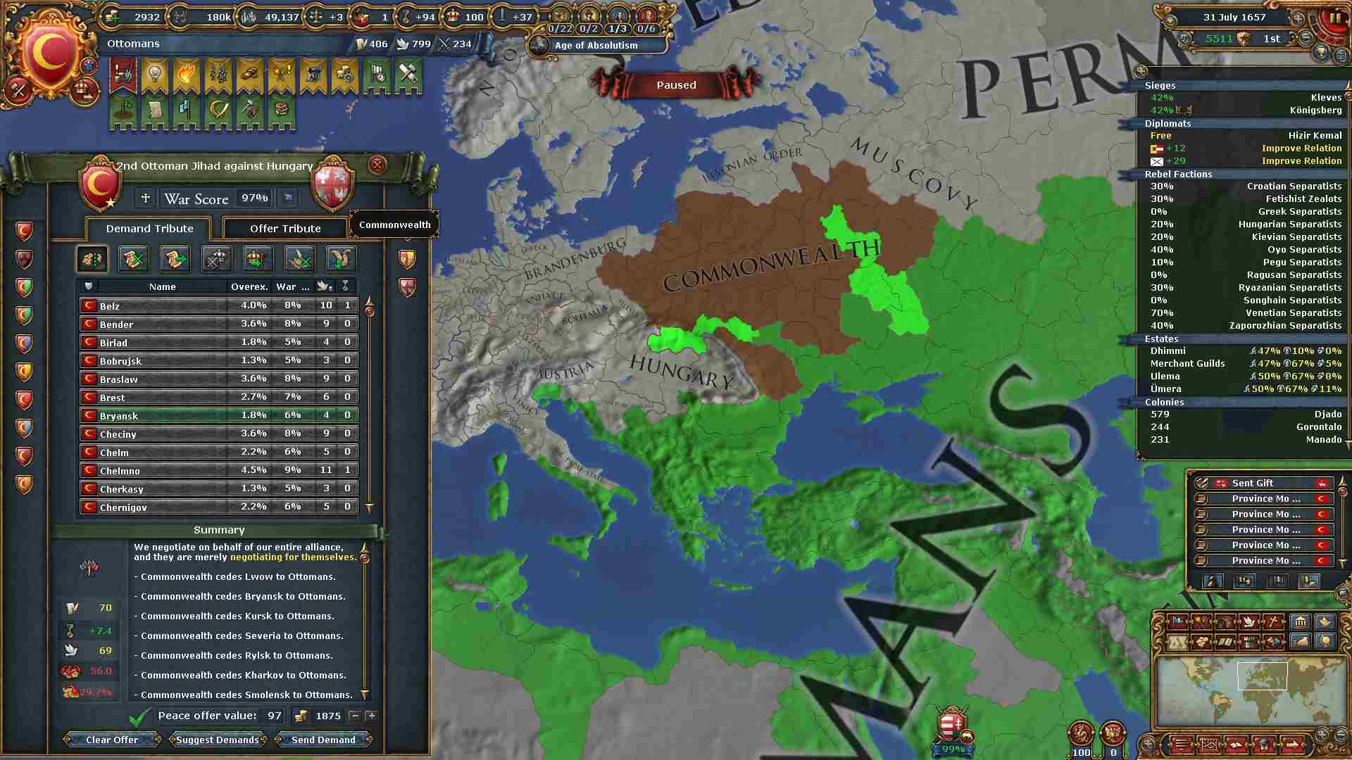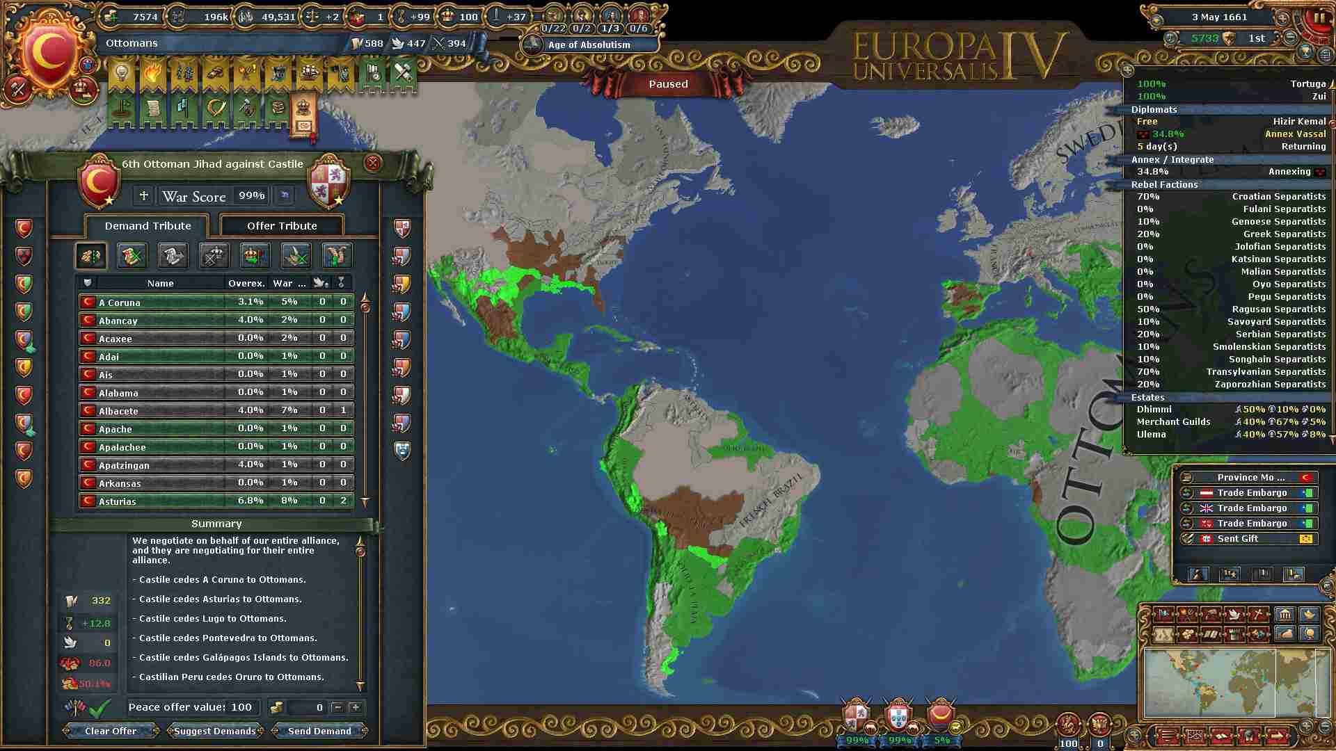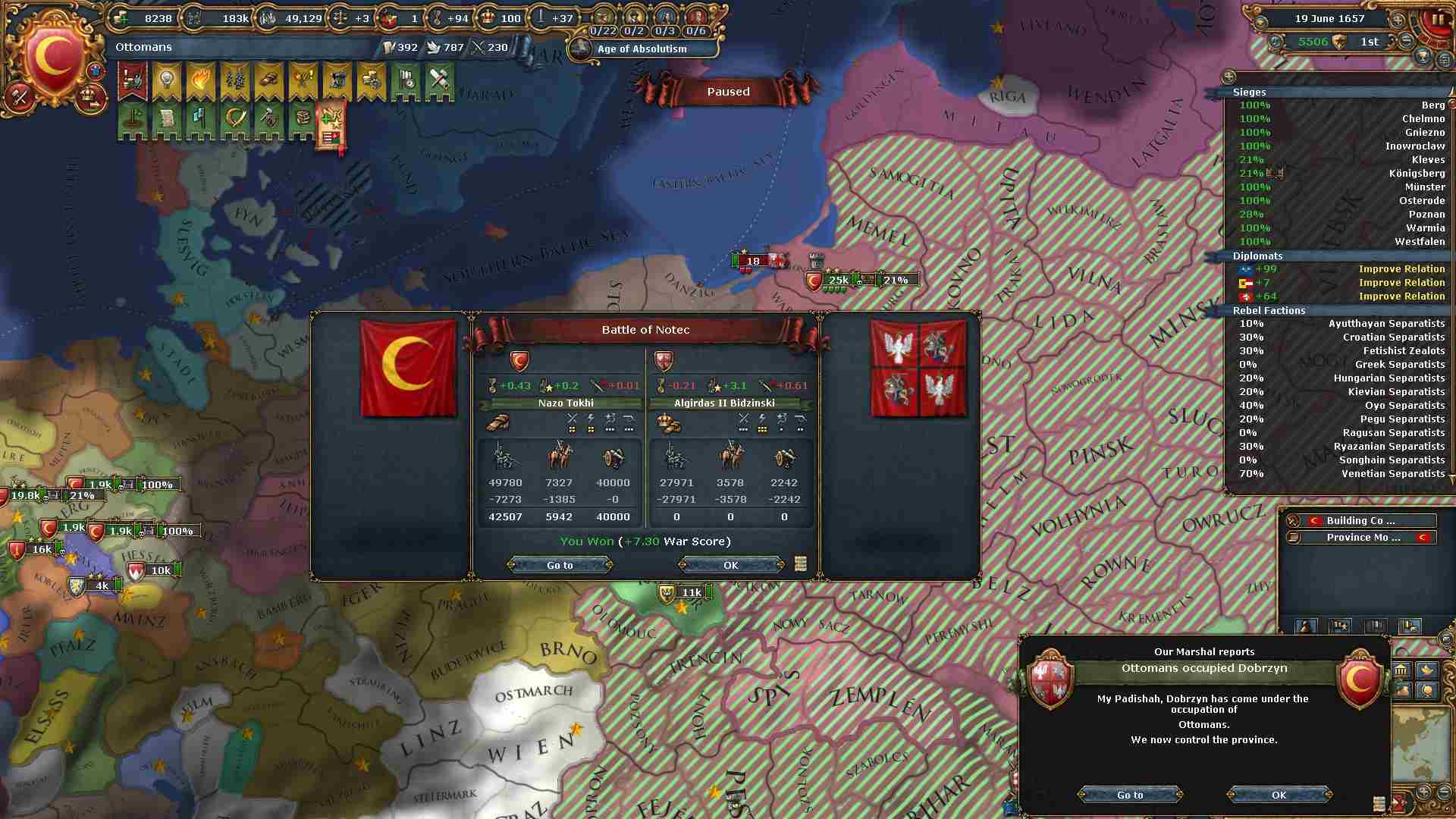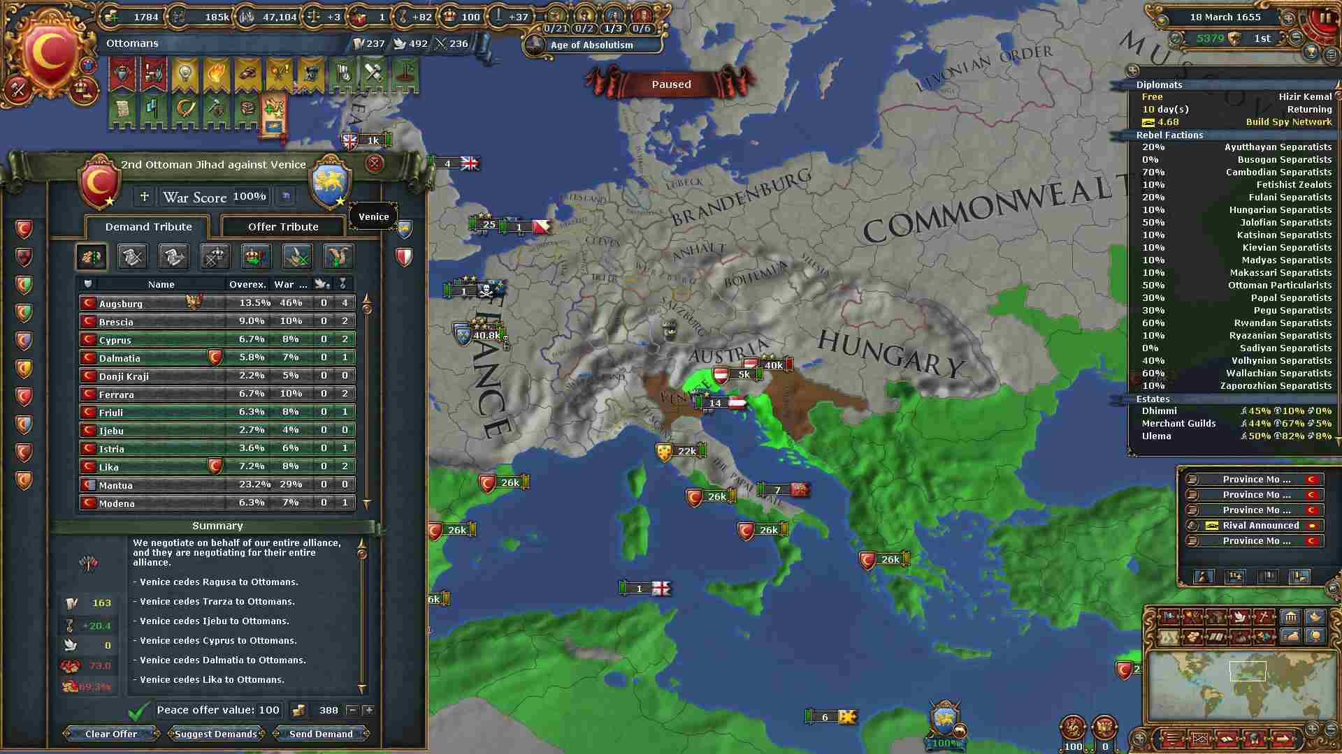戦勝点一杯に領土及び賠償金を得ています。